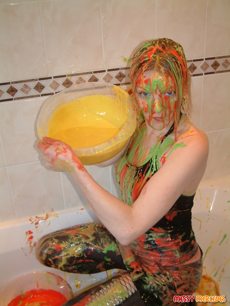 I'm wearing a black halter tie-up top, black mini-skirt, black ladder effect tights & flat shoes! :shock: I played with green glitter gunge & yellow, green & orange batter mix!! Watch me fill my pockets & then put my hands in them! :D Rubbing the coloured gunge into my body & dripping it all over myself...Yeaaaahhh!! :lol: