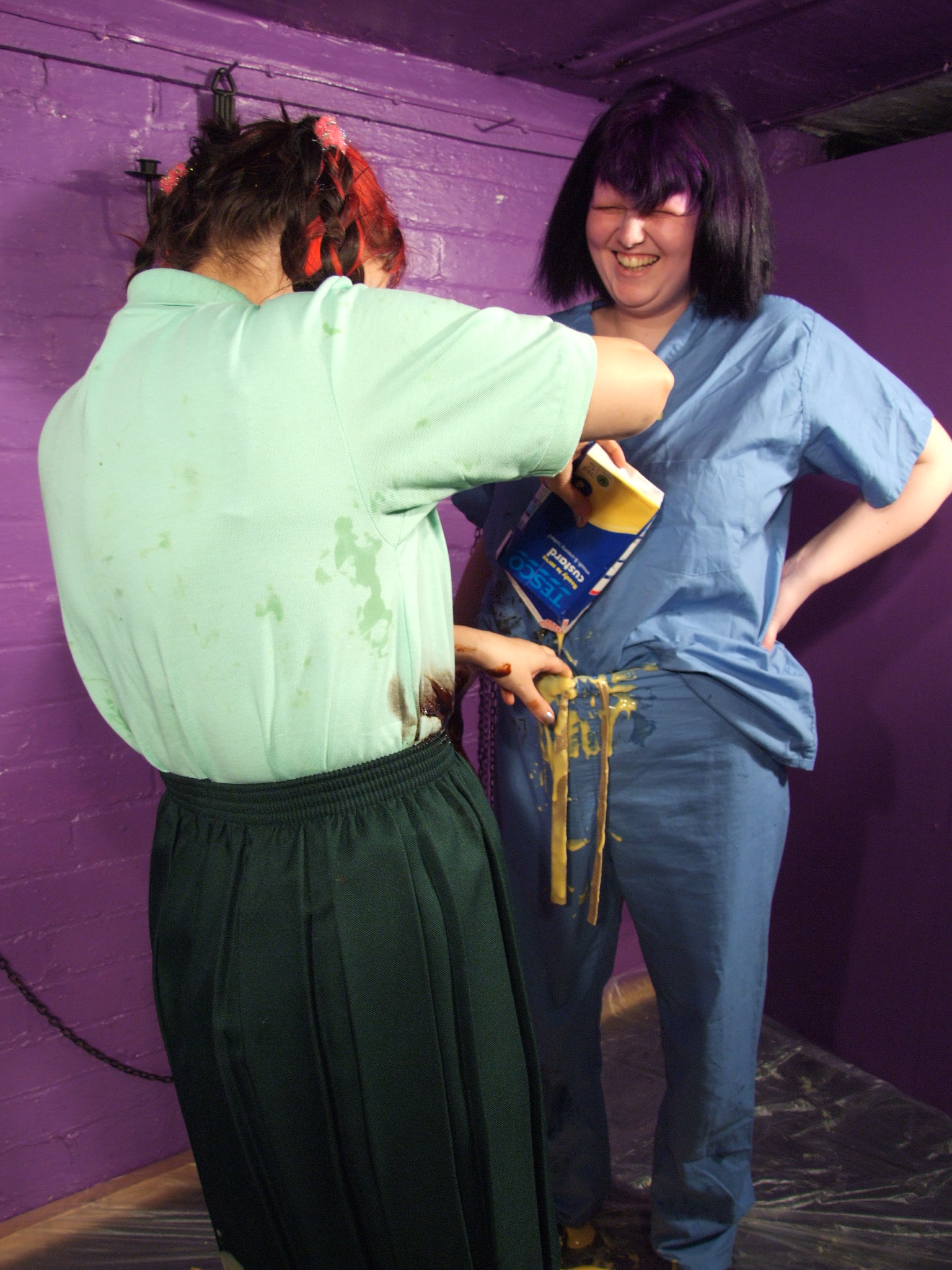 Now the camera starts to roll, and we see Lady Samantha having her polo-shirt filled with treacle by Lady Full-Wellington, the latter dressed in pale blue medical scrubs.