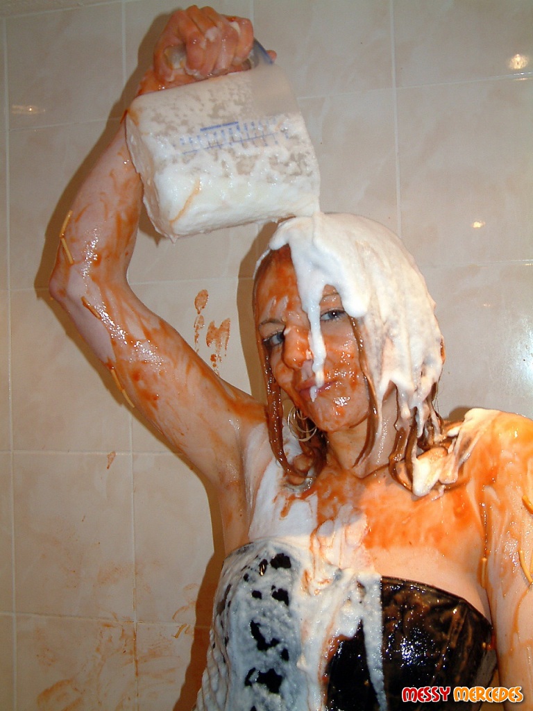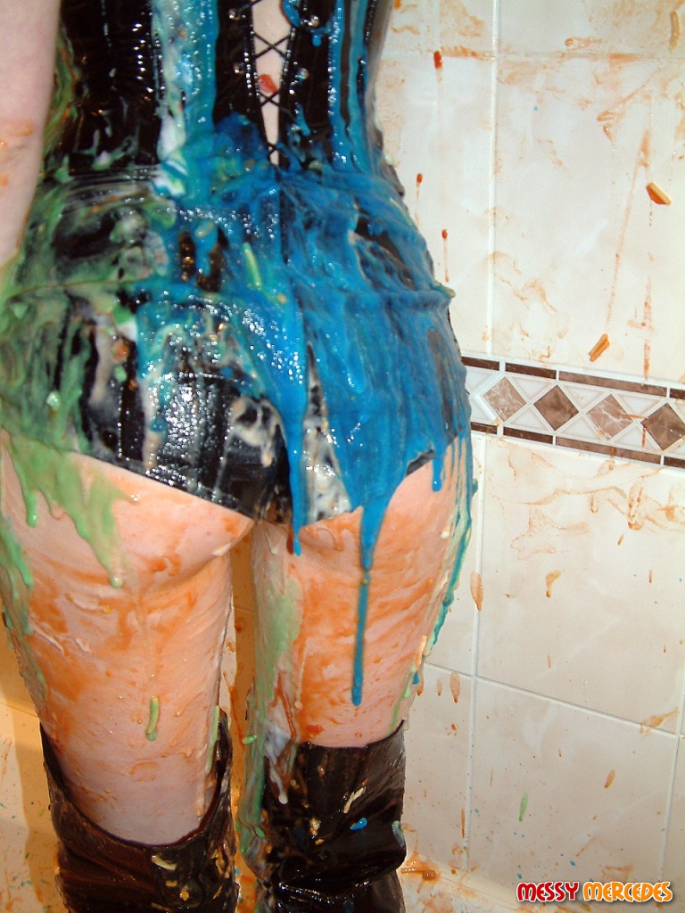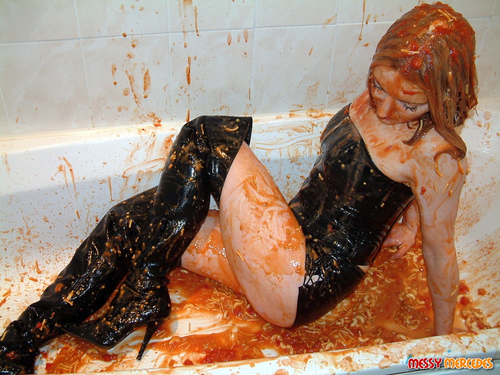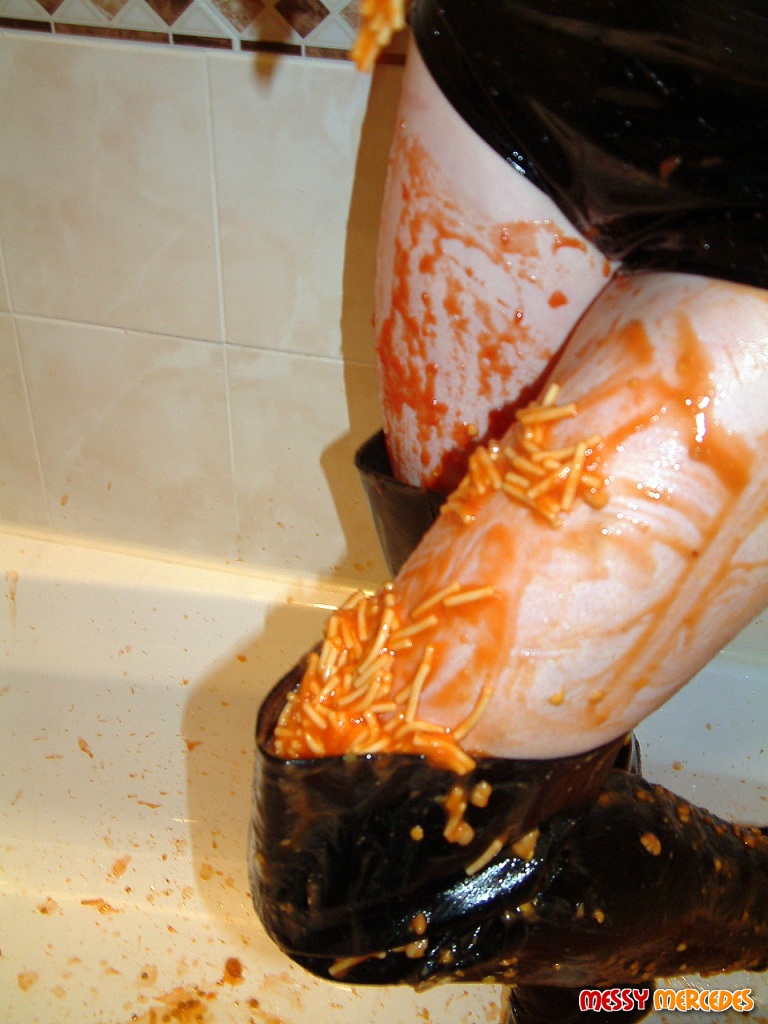 In PART ONE you'll see me slowly get my black PVC outfit messy using loads of chopped tomatoes, spaghetti, beans, soup & macaroni cheese.....what a combination hey!! Yum-yum!!