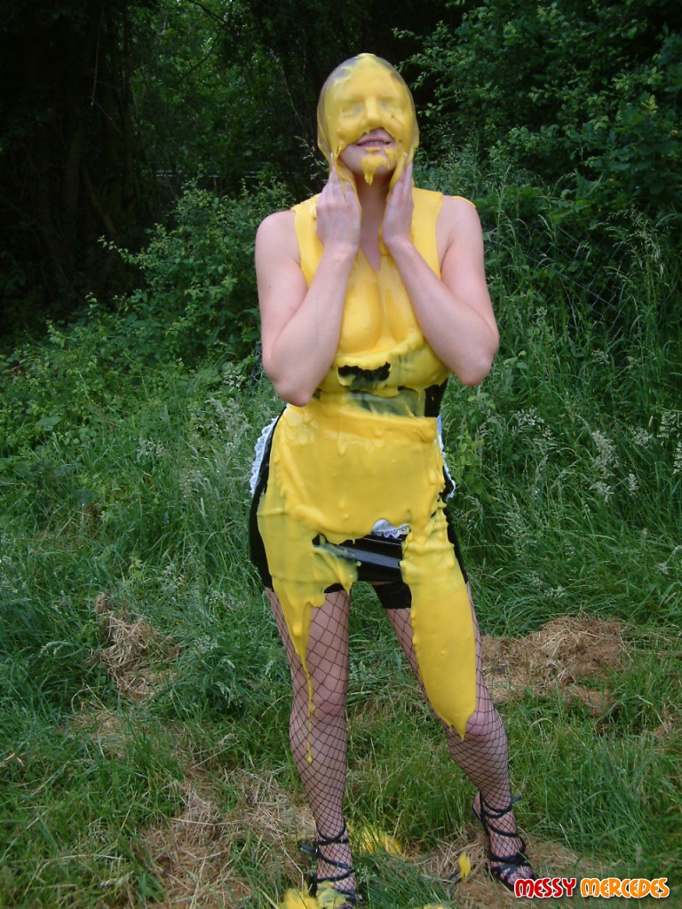 I'm a naughty PVC clad french maid I am. :twisted: ...I'm meant to clean up, but all I'm good at is getting messy! :lol: :lol: I love this outfit, the cut-out ass cheeks are great I think! :shock: I get yellow & blue gunge tipped over my head....then cums the salad cream & eggs...splatt :lol: :lol: