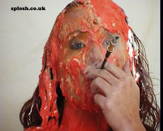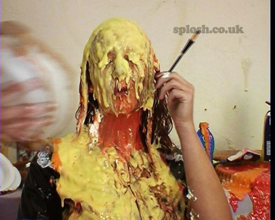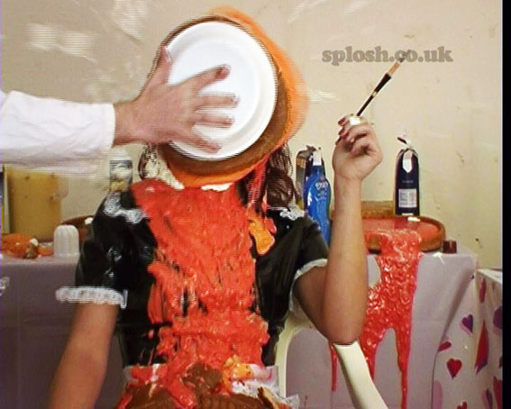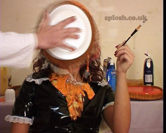 Tracie plays a waitress in a neat little PVC uniform who defies the restaurant smoking ban and gets her comeuppance at the hands of the chef. A baker's dozen BIG, HEAVY PIES (not foam but the same recipe as at the end of Mucky Puppies with proper bases) get slammed rather brutally into Tracie's face. She is deluged with at least four litres of custard and a full bucket of chocolate pudding but does it stop her? Does it hell!