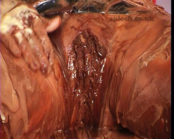 On the contrary as well as smoking she starts undoing her uniform and rubbing the chocolate into her boobs then filling up her lacy white panties with chocolate syrup and playing with her pussy. Then she takes her knickers off to play unhindered in a very saucy ending indeed. meanwhile the mad chef continues to pie her as her sticky fingers do their work!
