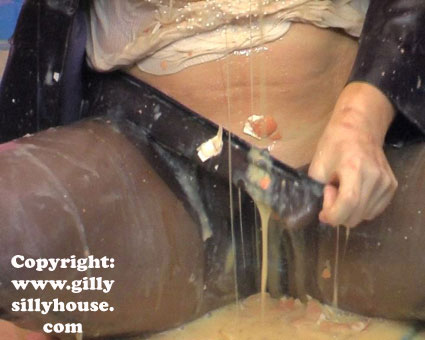 Egg shampoos, eggs down my cleavage, eggs down my tights front & back not to mention sitting on a whole tray of them (and yes, they did break!) with some incredible close-ups of egg-sodden satin make this over 22 minutes of gleaming, gooey fun (and no silly yolks or voice-overs this time!). It's simply THE film for satin and egg fans and can be seen by joining up at www.gillysillyhouse.com along with dozens of others.