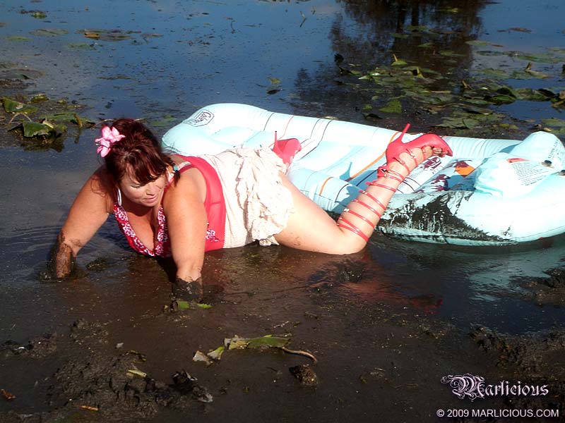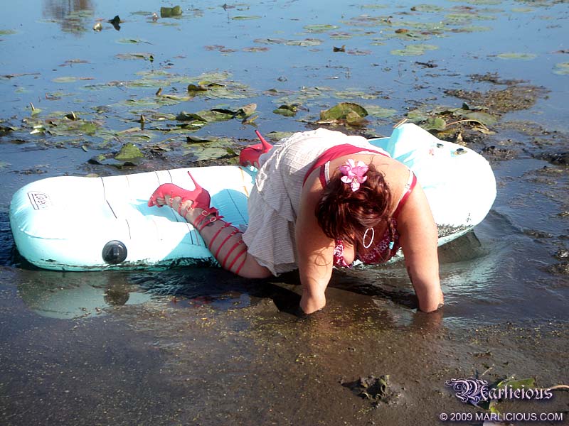 Marlicious was relazing on her little air mattress when all of a sudden she realized she was in a swampy place. Not wanting to get her New York red shoes muddy, she tries to escape the swamp with her feet safely up in the air. Will it work?