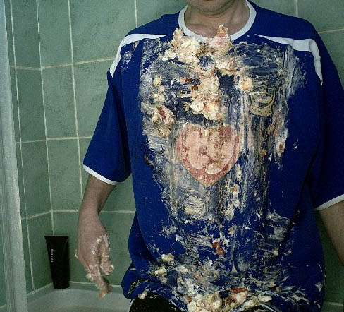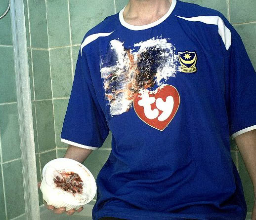 Hi, I noticed that Portsmouth are still bottom of the premier league, so I decided it was time to get one of their shirts a bit messy, I used a nice strawberry and cream pie to mess up their shirt.