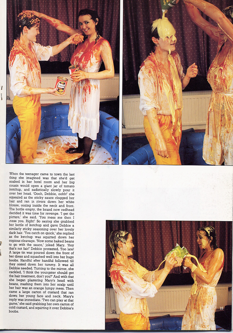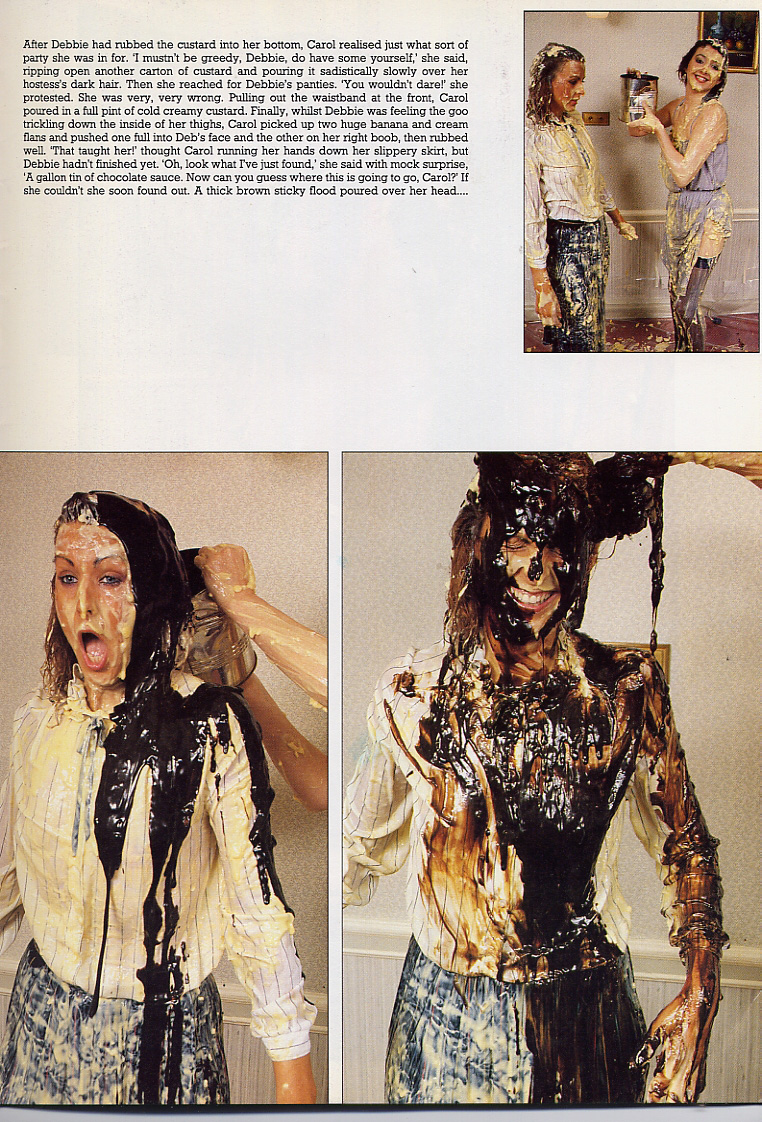 DD Debbie's debut with Carol in colour in their immaculately dressed eight page food fight with great chocolate coverage and knicker-filling! (Ending topless for the first time)