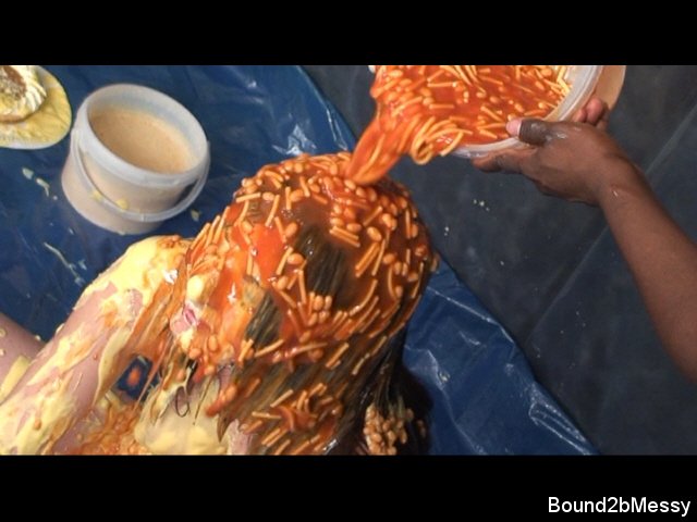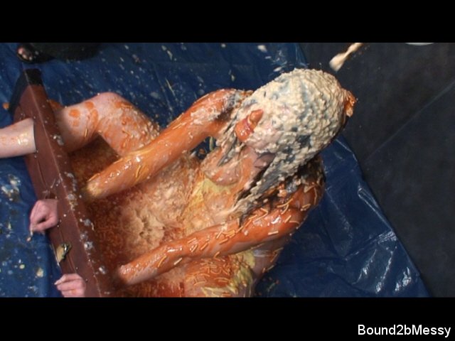 Its only when the sploshing begins that Honey realises she cannot wipe her eyes or face as the mess just keeps on coming!