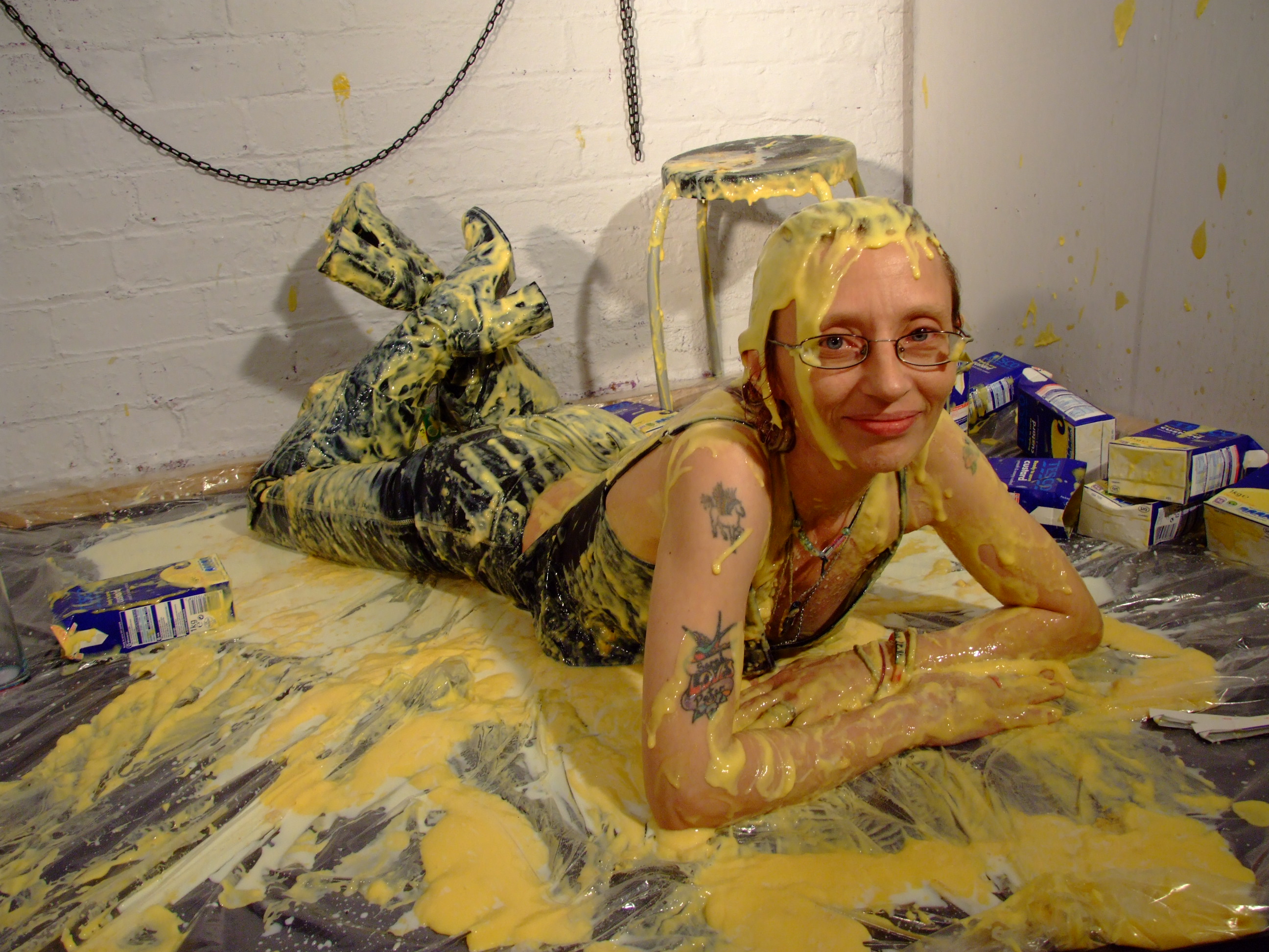 She starts off by pouring a glass of milk into her trousers, then slowly covers herself completely, including custard-pie sitting, trouser-filling, top-filling, boots-filling, custard shampoo, and lots and lots of pouring over herself.
