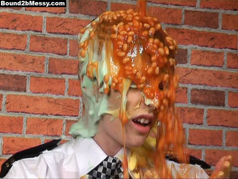 But our sexy WPC is more interested in experiencing a Trash Can Alley sploshing herself than making arrests and its not long before she ‘cops’ a pie sandwich followed by pots of beans and spaghetti, black oil, custard and tomato ketchup all of which has Fi rolling round the alley with unashamed pleasure.