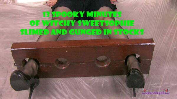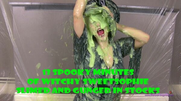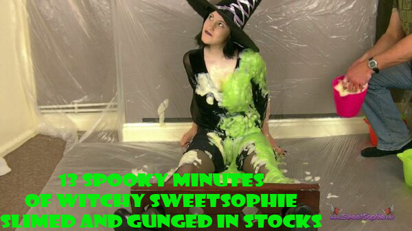 Witchy SweetSophie gets put in stocks then has green slime & spooky white gunge thrown all over her :P