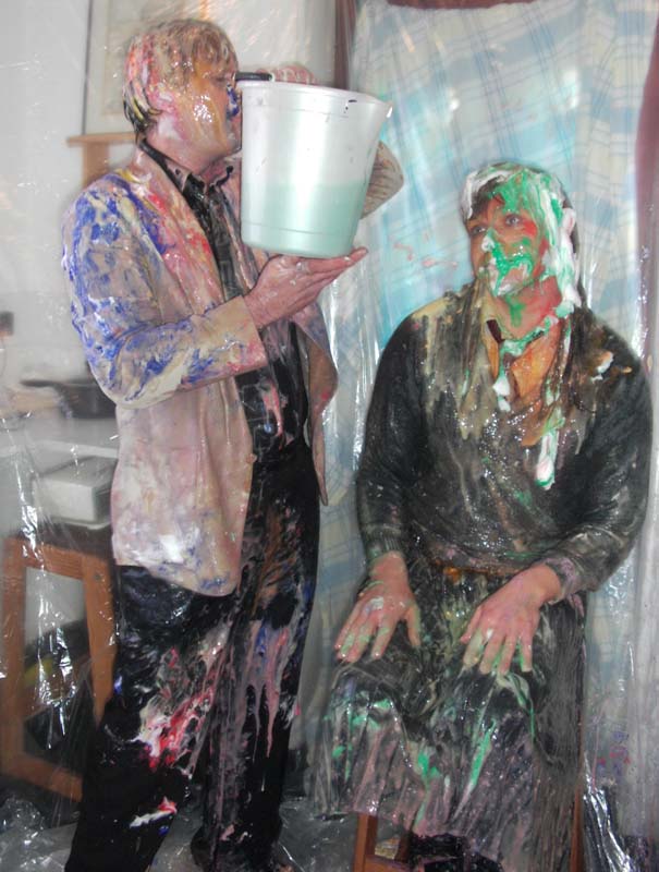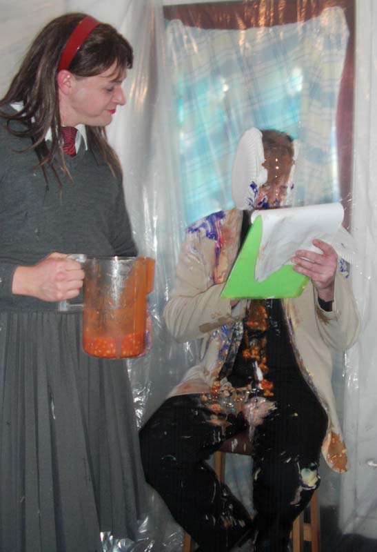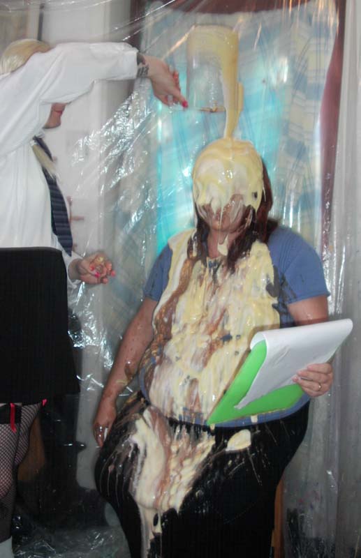 Wamdrogony Media Dating - We'd wanted to have a go at doing the most gungings possible in as many different outfits as we could. When I found an inflatable armchair shaped like a pair of giant lips in a car boot sale, we decided to do a video dating mockup. Messy Jo and I improvised a succession of bizarre characters getting gunged as we took turns recording our dodgy video dating ads as the other cleaned up and picked out a costume for the next one. In between we had Andy doing a series of morose pieces to camera, winging about all the horrible work we made him do. Aw, bless.