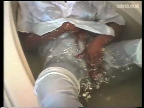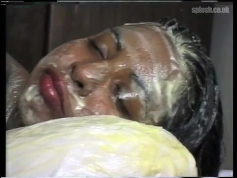 Golden brown Pam from Mauritius (another non-professional who wanted show us how she likes to get messy) slips into her gleaming white satin pyjamas and then turns them slippery, squishy & see-through by first taking a bath in them, then coating herself in cooking oil and custard on her bed. The water and oil turn her PJs totally transparent revealing her nut-brown nipples, dark bush and black stockings through the super-slick satin. No wonder she can't keep her hands from sliding inside her translucent pants to finger her fanny! A fabulous sight.