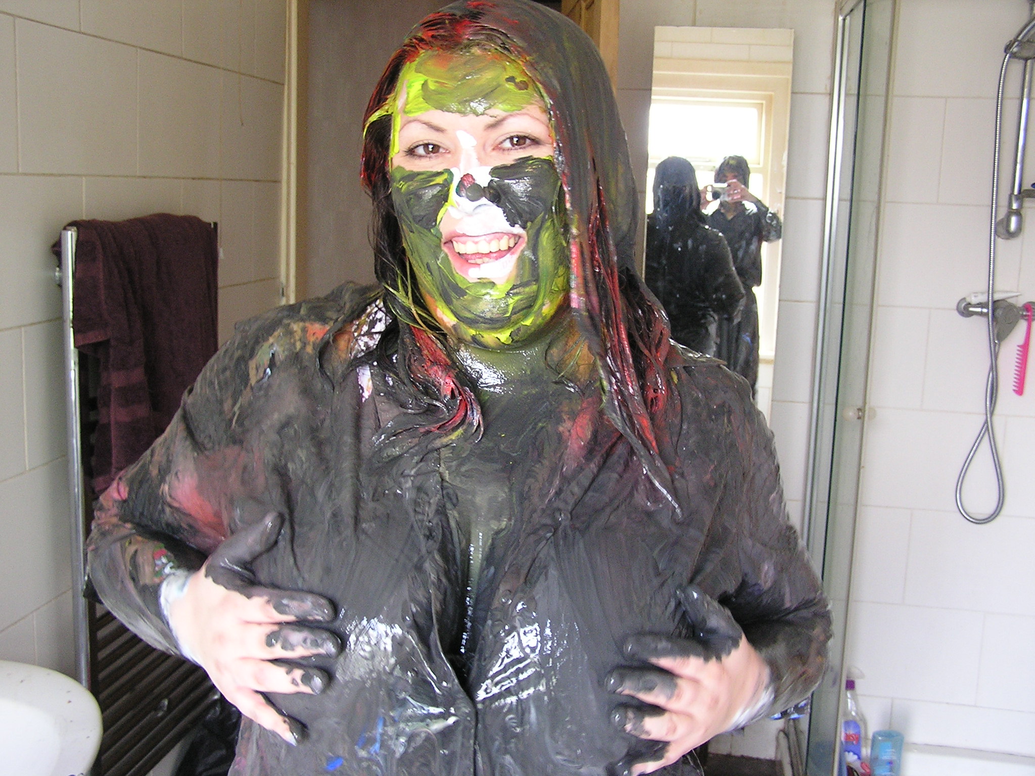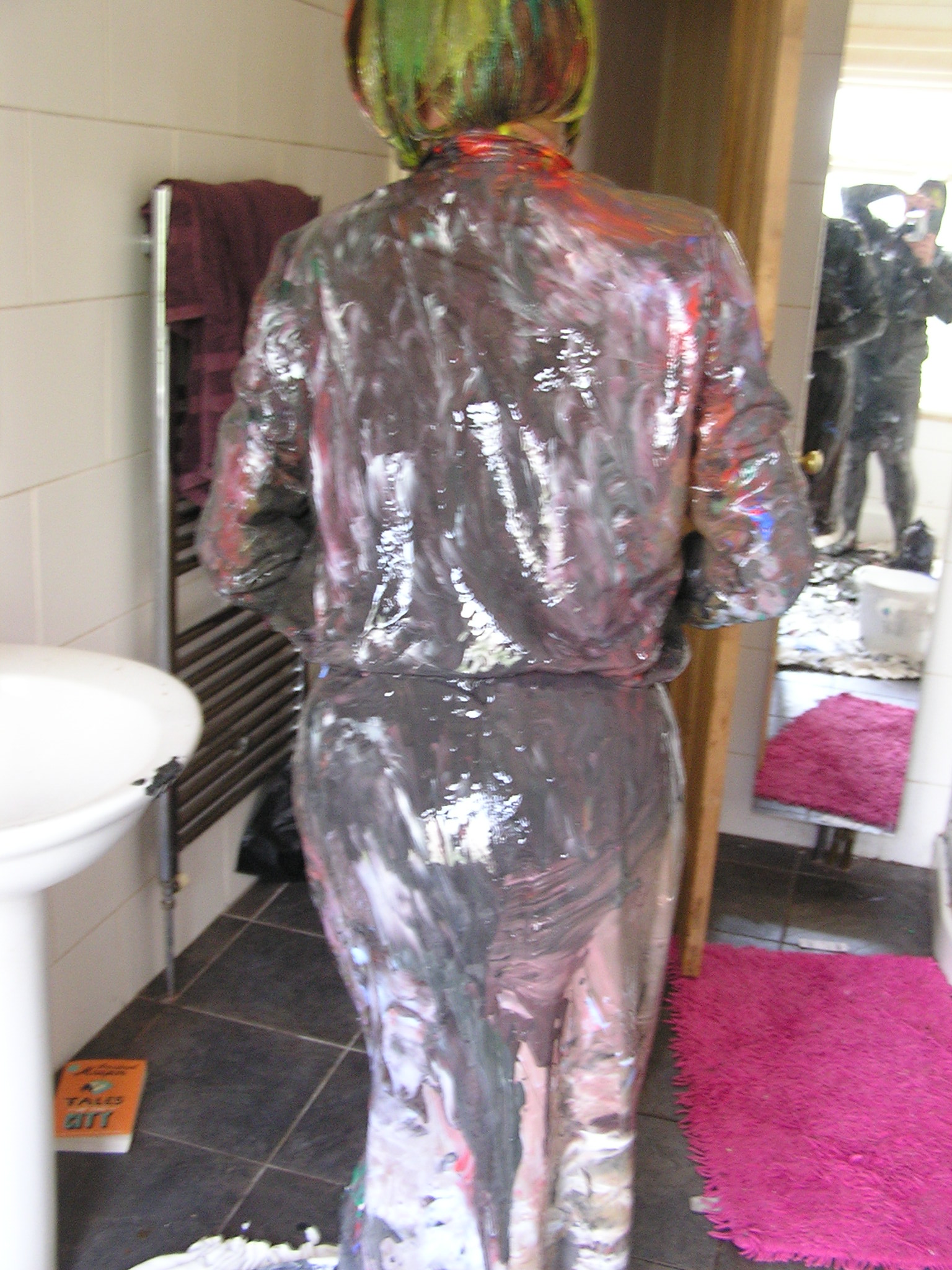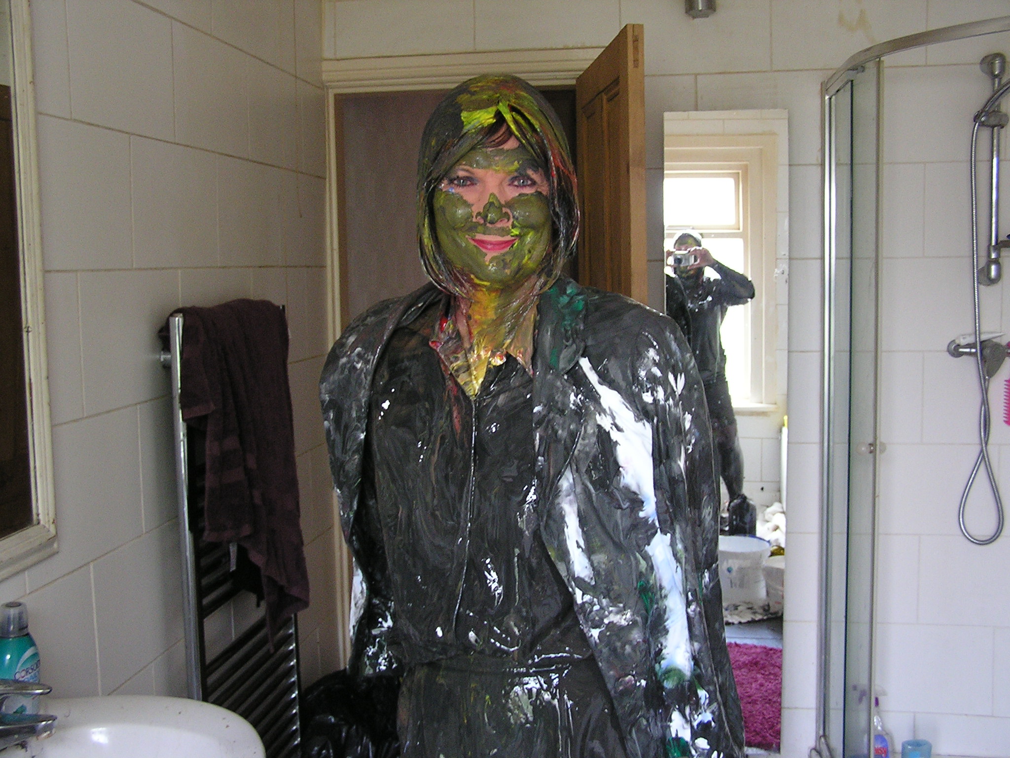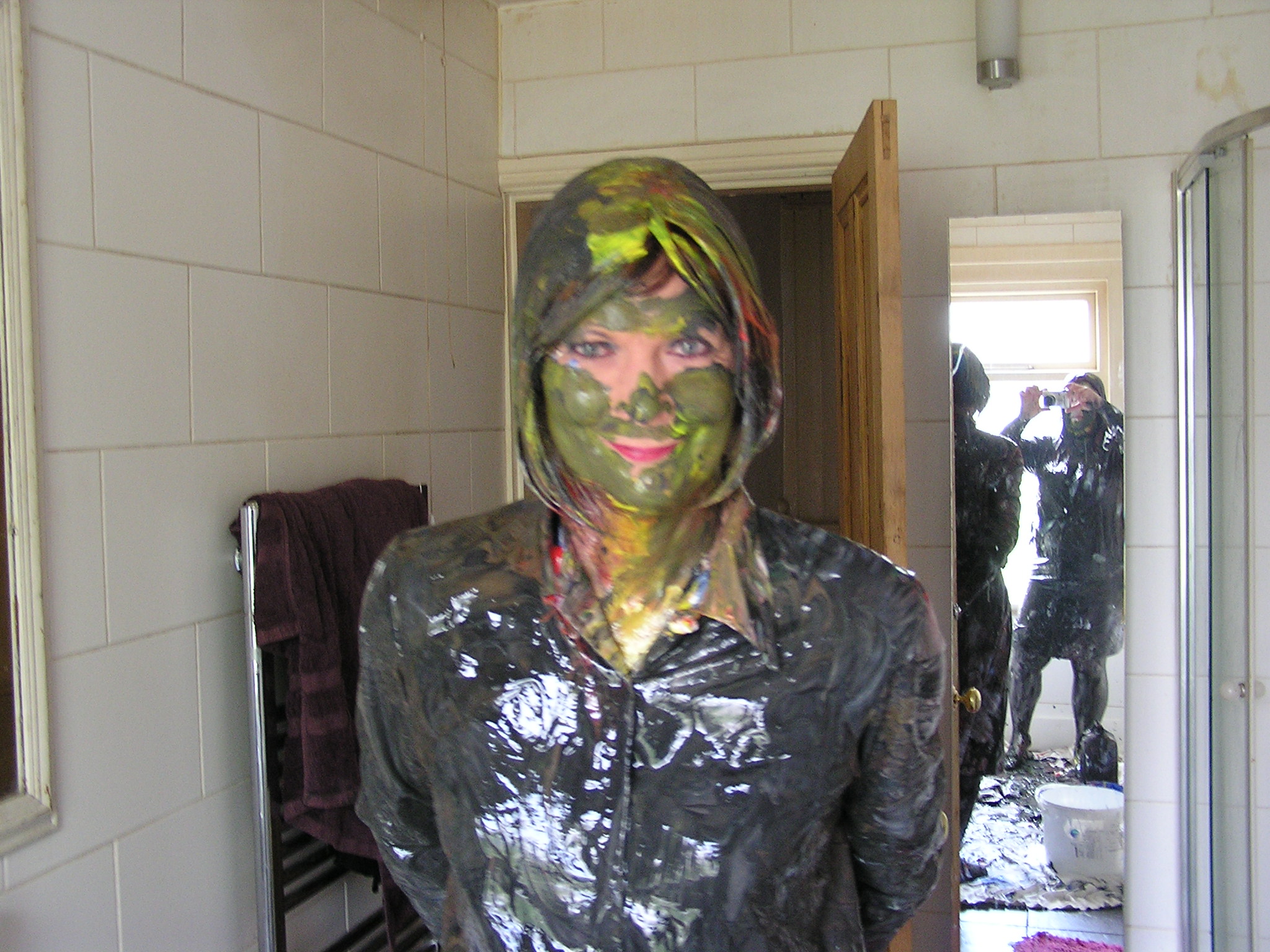 After giving her a telling off she decided to pick up the paint brush----and painted me! Obviously I returned the compliment and you can see the results below after white,blue,red,green,yellow and black paint were used.