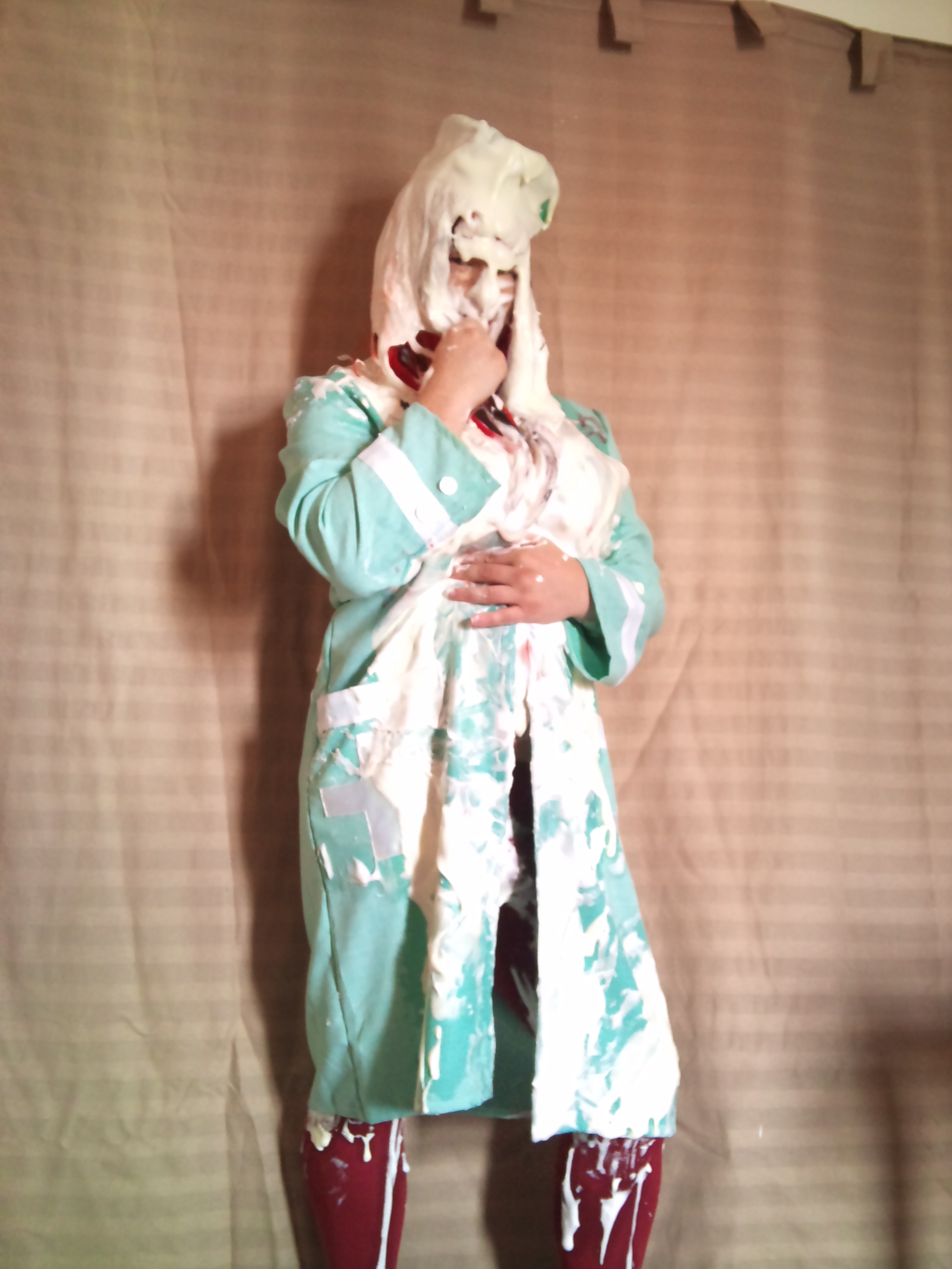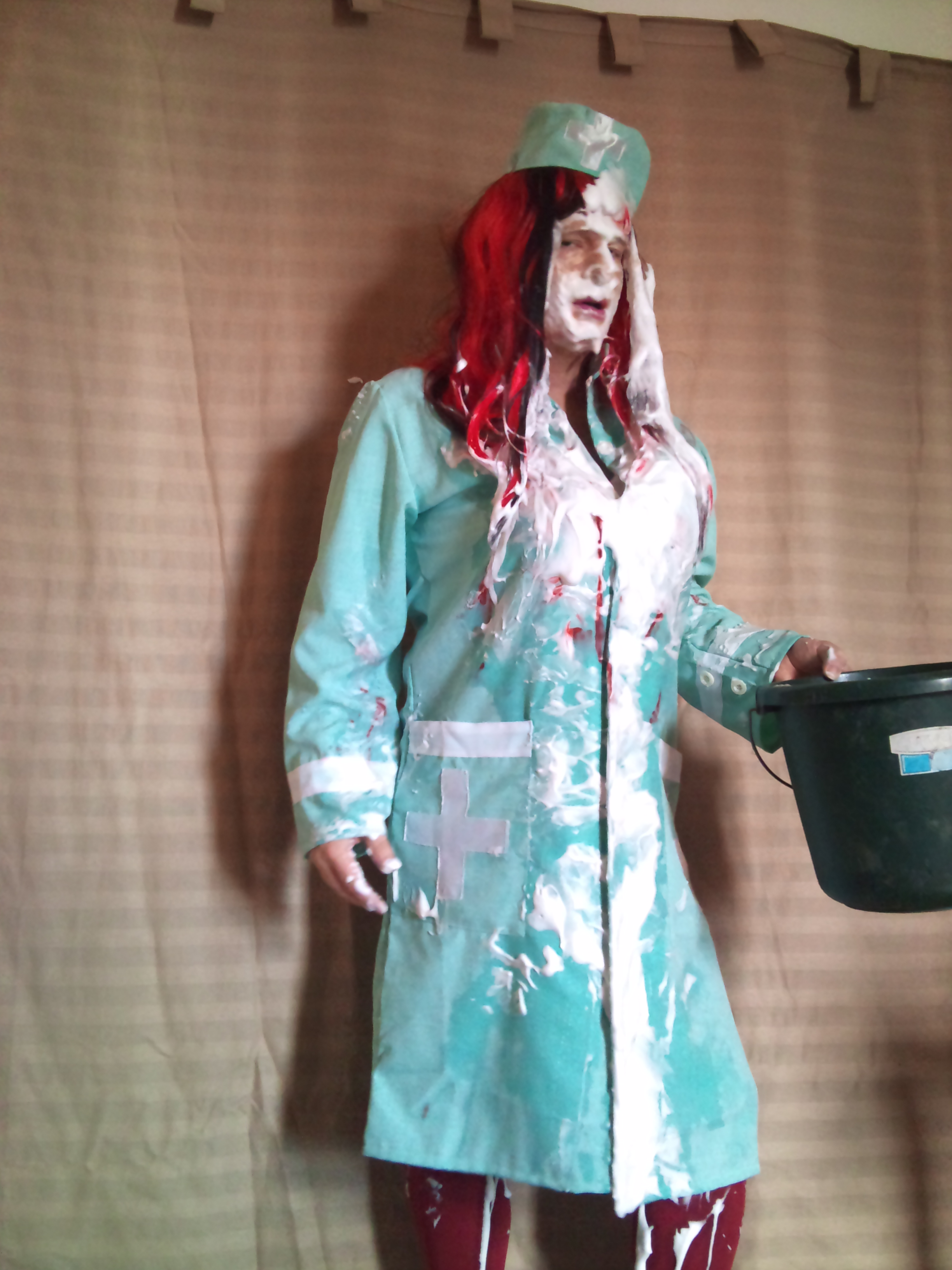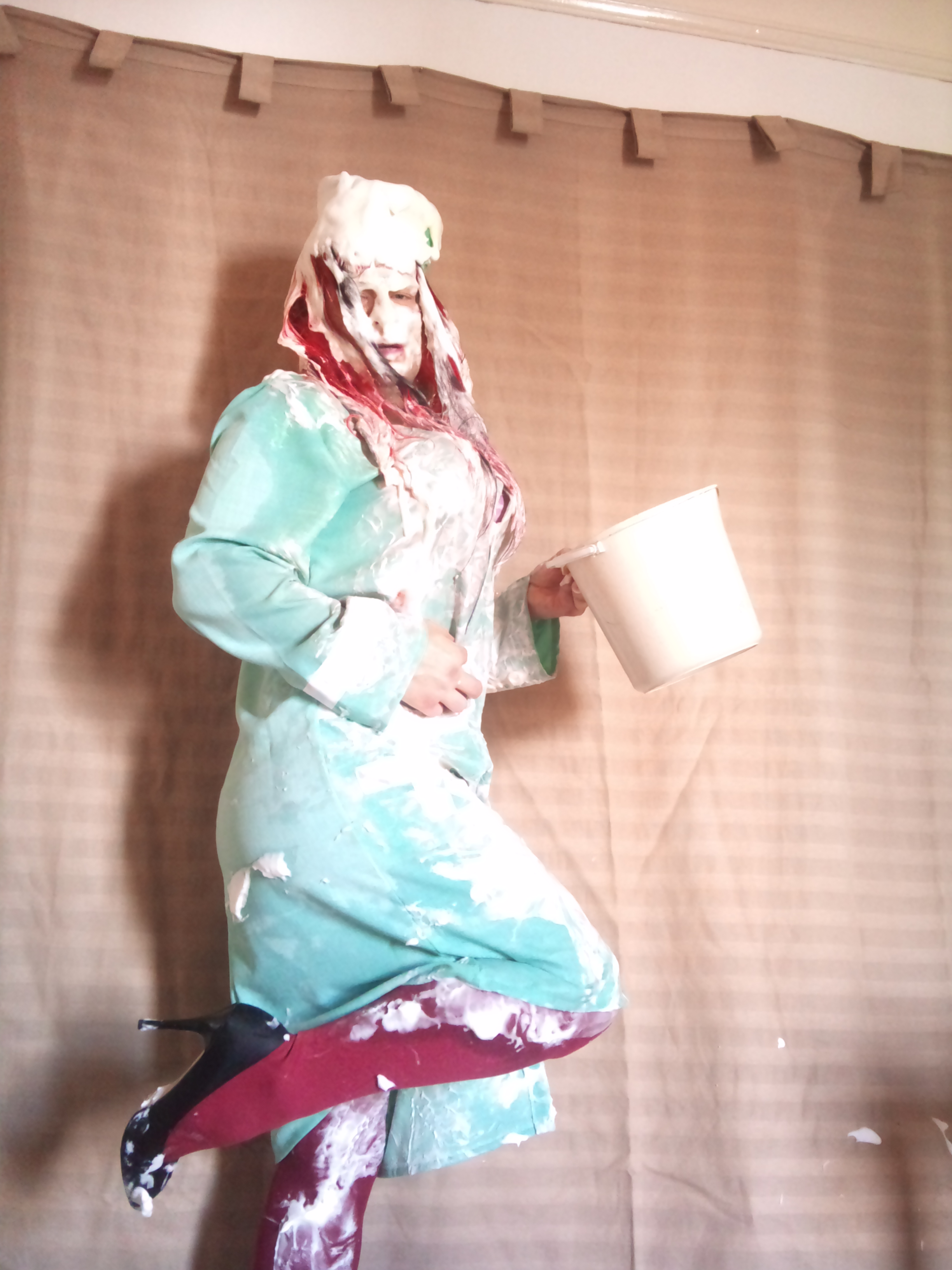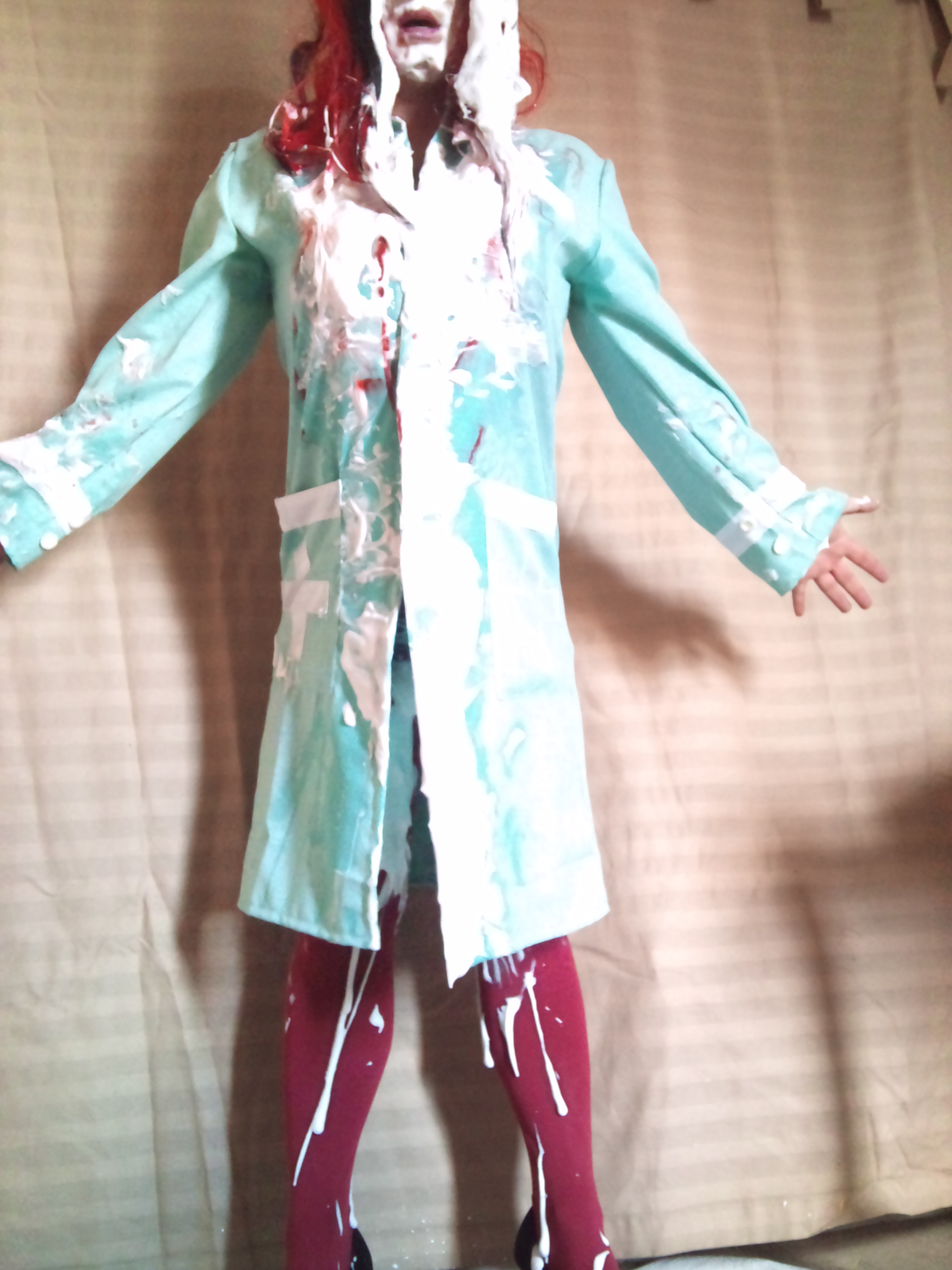 :D Wow great stuff, hobgoblin, i just love ladies overalls /workwear getting on the receiving end of a mess, particularly like the bucket og goo down the cleavage. Solo photography has always been a bit of a pfaff, most cheaper compct camera,s have a setting for 2 photo,s with a gap of 10 seconds, i would love one that does 5 or 6 in a given time but that involves a much dearer camera.Getting the light setting just right is a bit of playing around with the settings and can take ages to get right, but your pics are really good so good luck with future sessions, maybe more white coats/overalls please. cheers :D