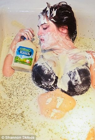 The pictures show size 12 Ms Upton, from Dallas, TX, in a series of suggestive poses, languidly posing in a bath full of ranch dressing in one and lying naked, prostate on a bed of lettuce and with an apple in her mouth, mimicking a hog roast, in another.