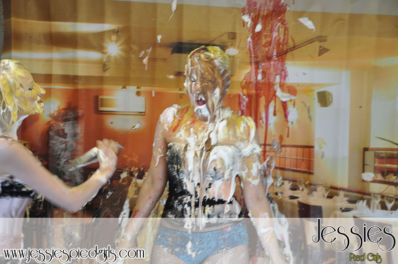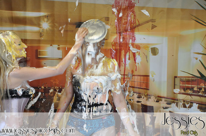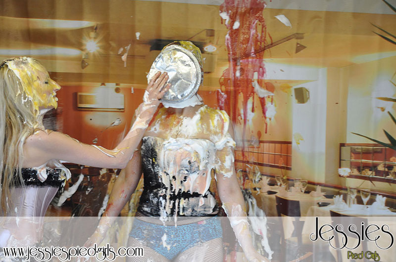 Cherry and I are dressed in sexy pin-up style outfits, fishnets, stockings, suspenders and corsets! And we then take it in turns to pie each other with big, filled, creamy pies!