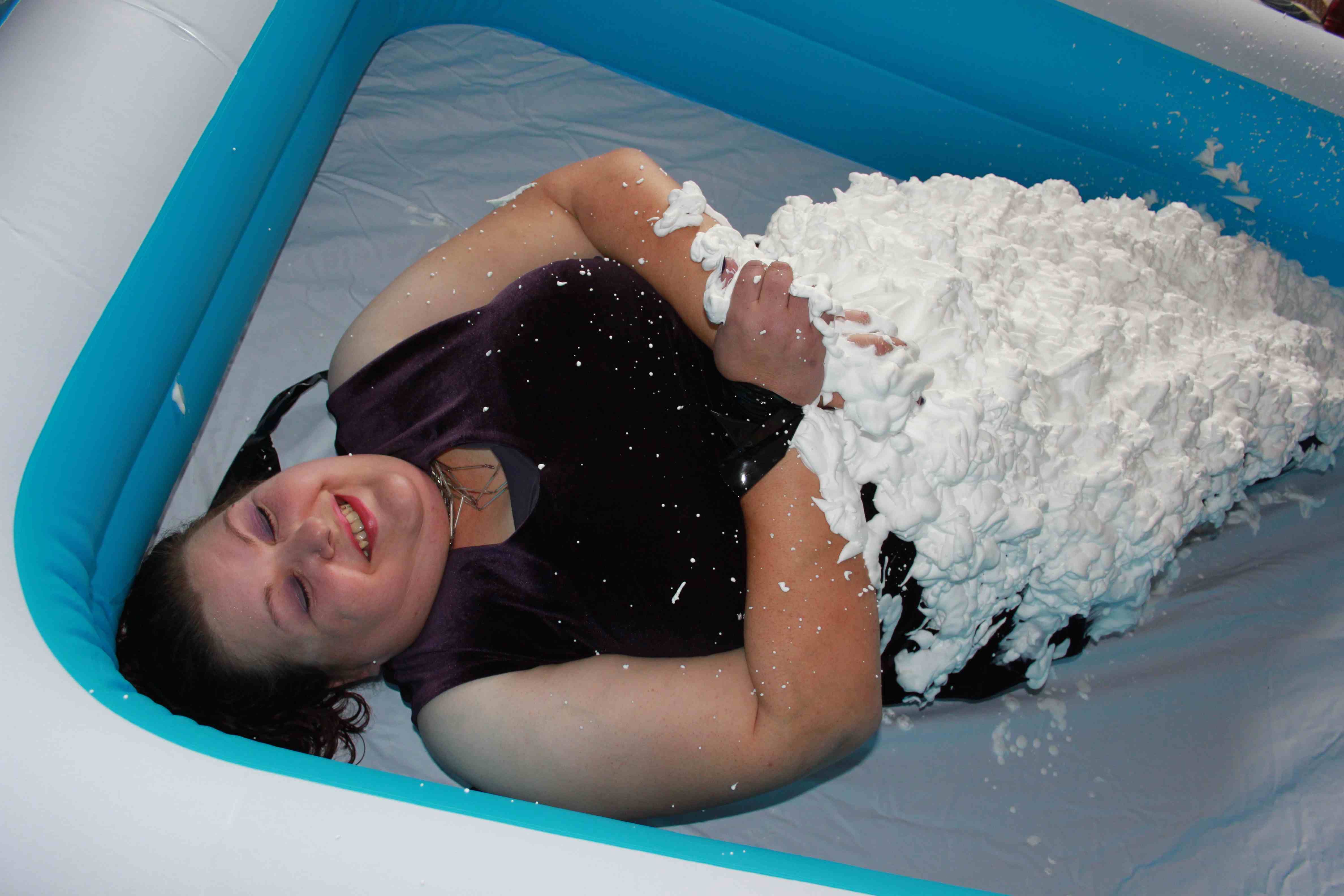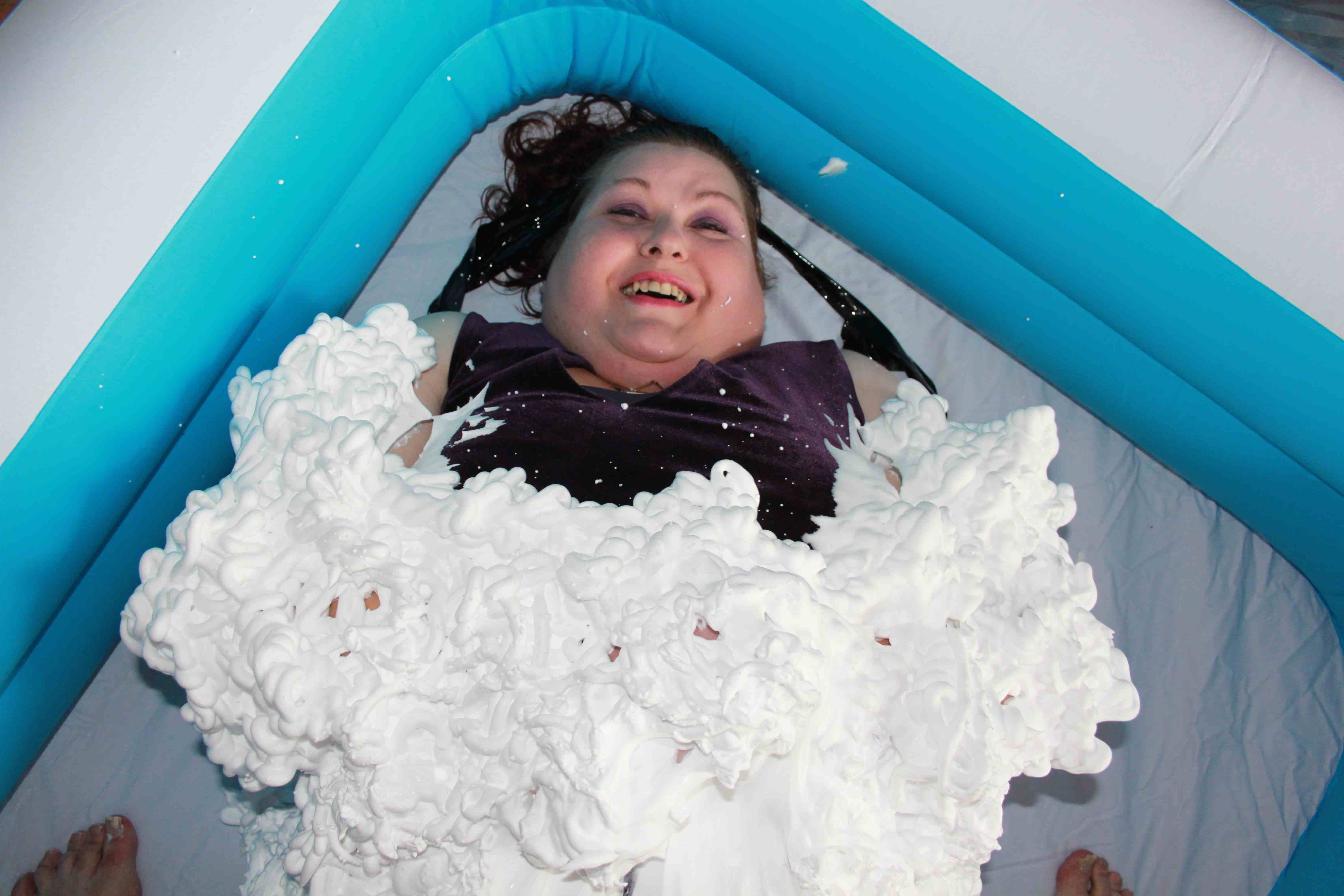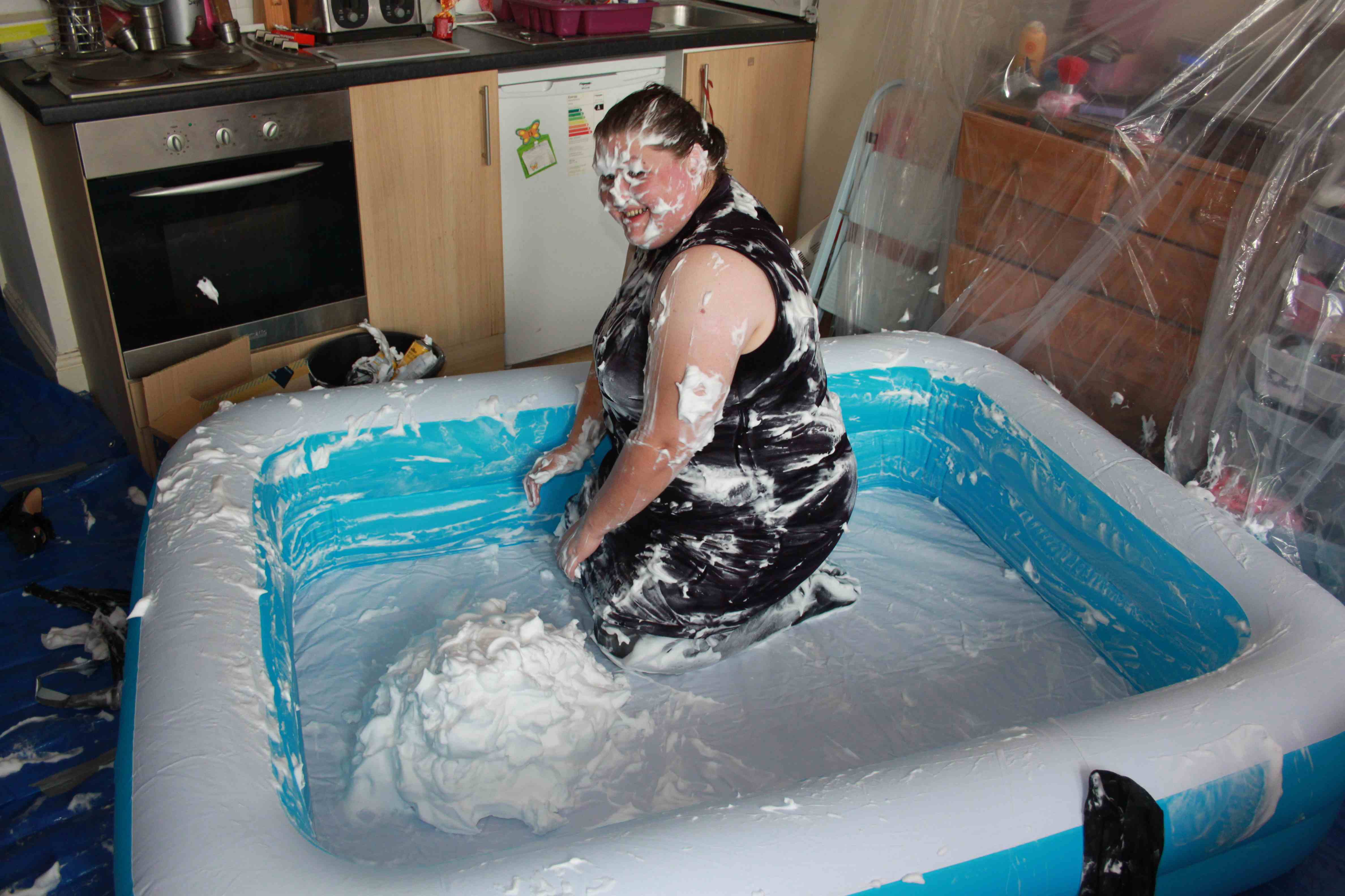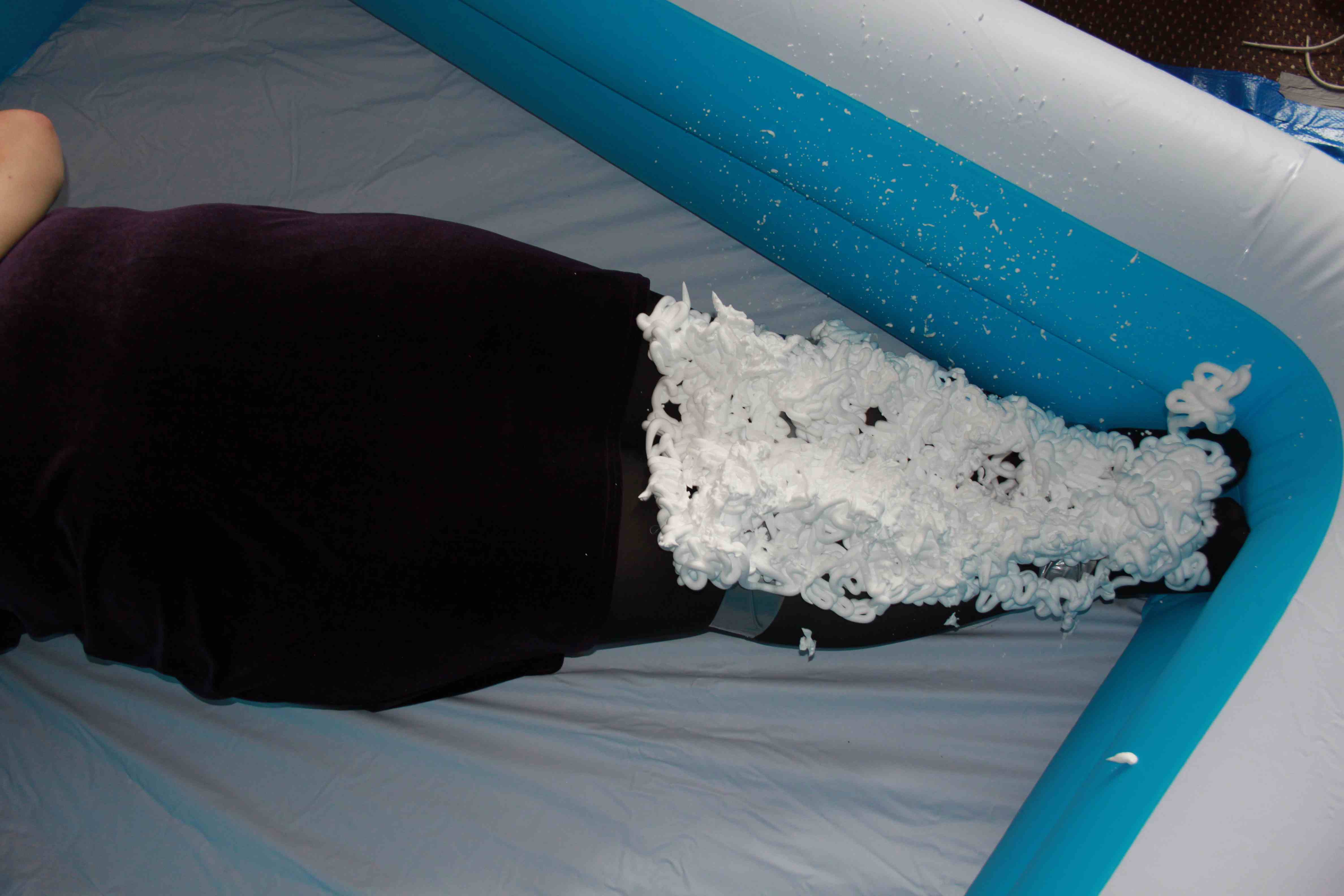 My friend and I have had numerous conversations about our WAM fantasies - he wanted to totally engulf a "damsel in distress", whereas I wanted to be engulfed in foam. So we devized a plan, got a pool and a ridiculous number of cans of shaving foam. The rest ain't exactly rocket science but was a lot of fun! I was bound by the feet, knees and wrists and made to lie down whilst he smothered the foam over my lovely velvet dress and opaque tights. After I was untied, we had a bit of a tussle in the foam with more than a few dodgy wrestling moves, the fiend! Here's a couple of teaser pics, rest will follow once I've got them on disc.