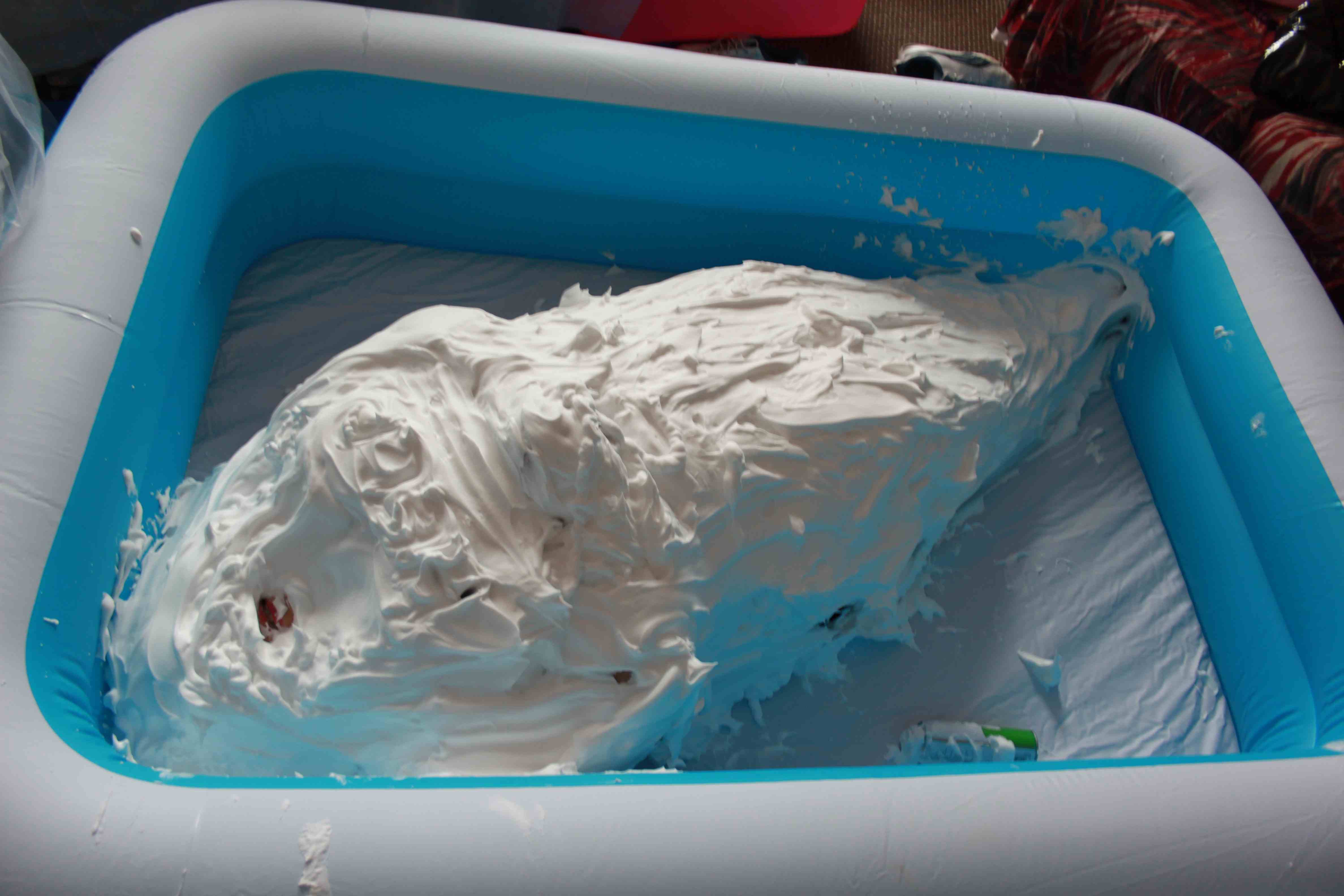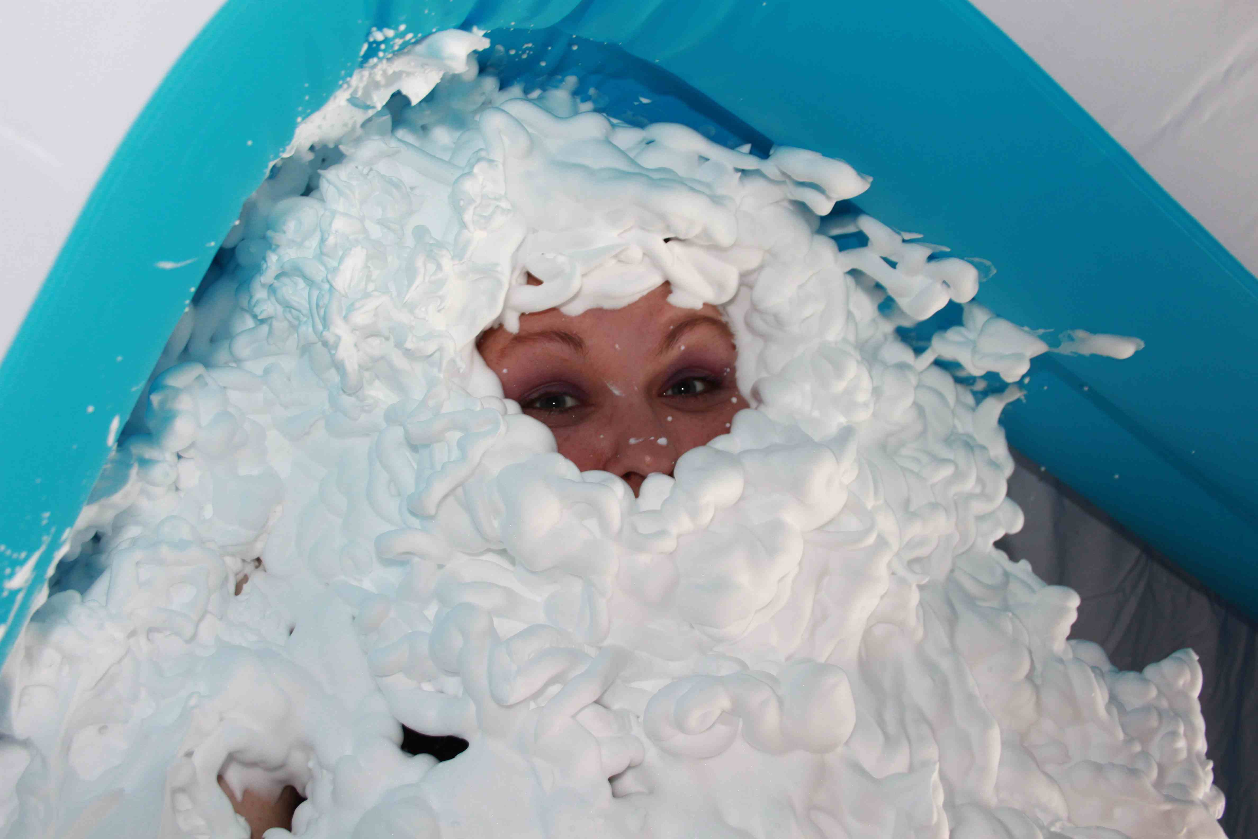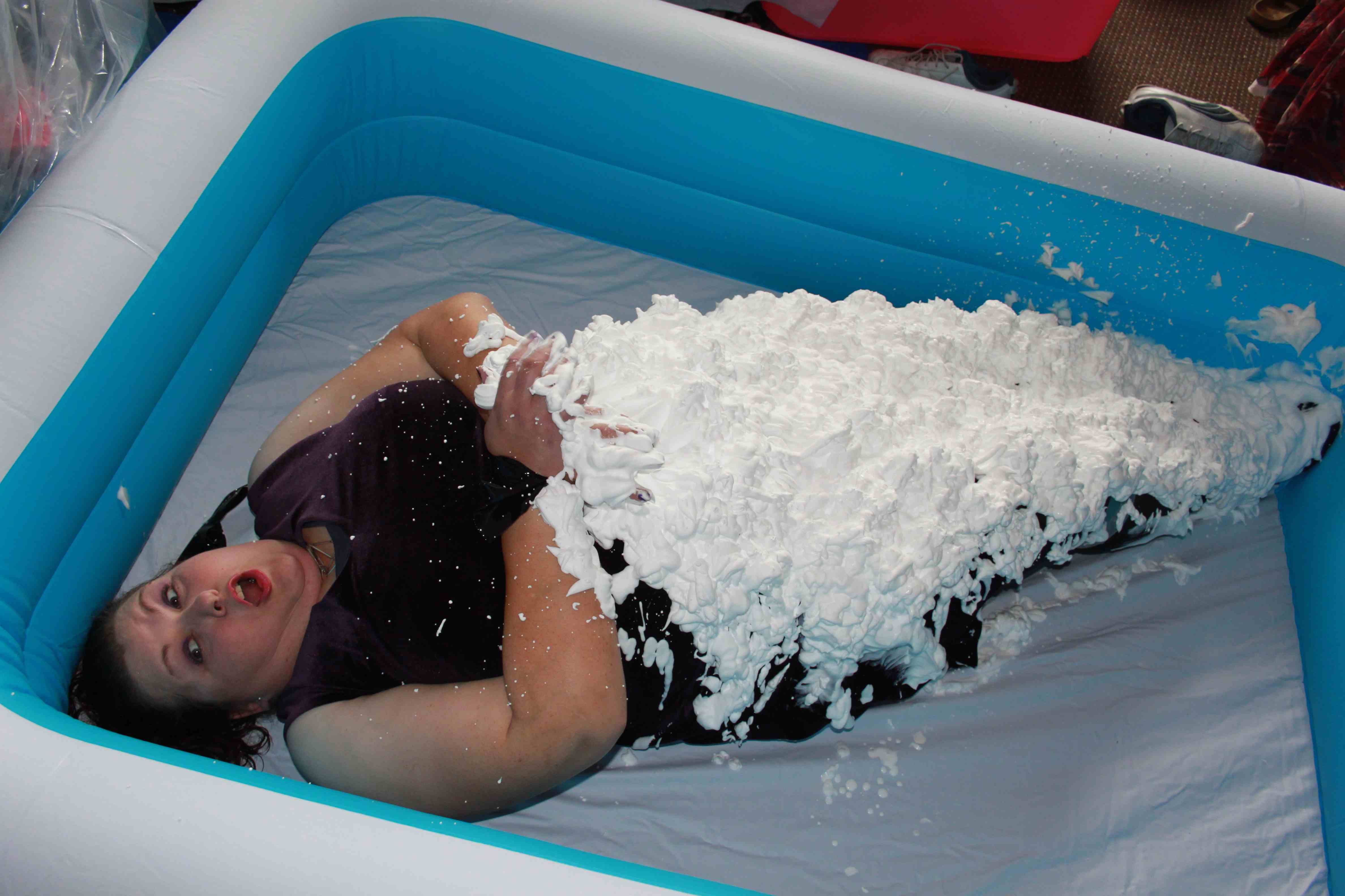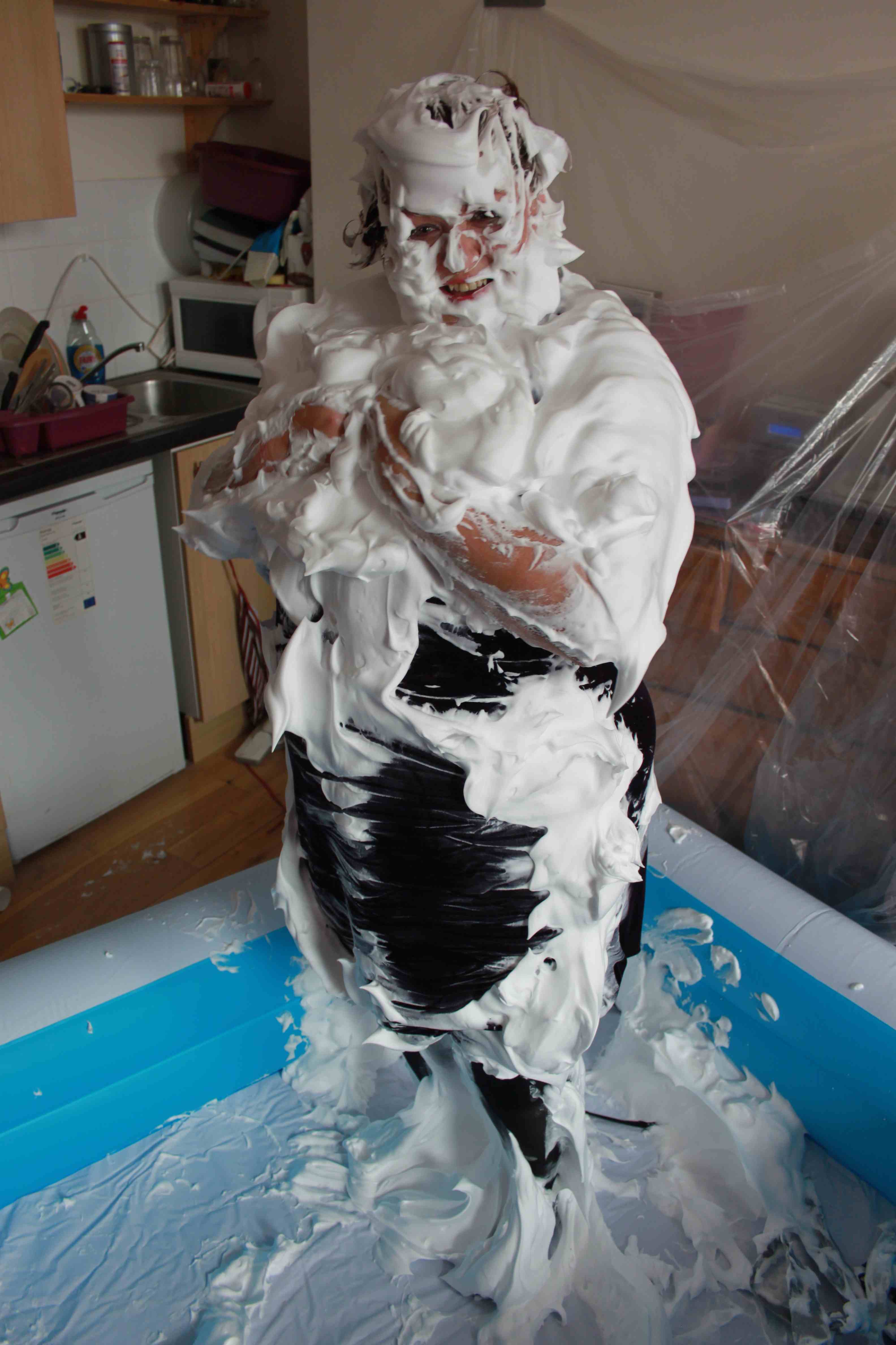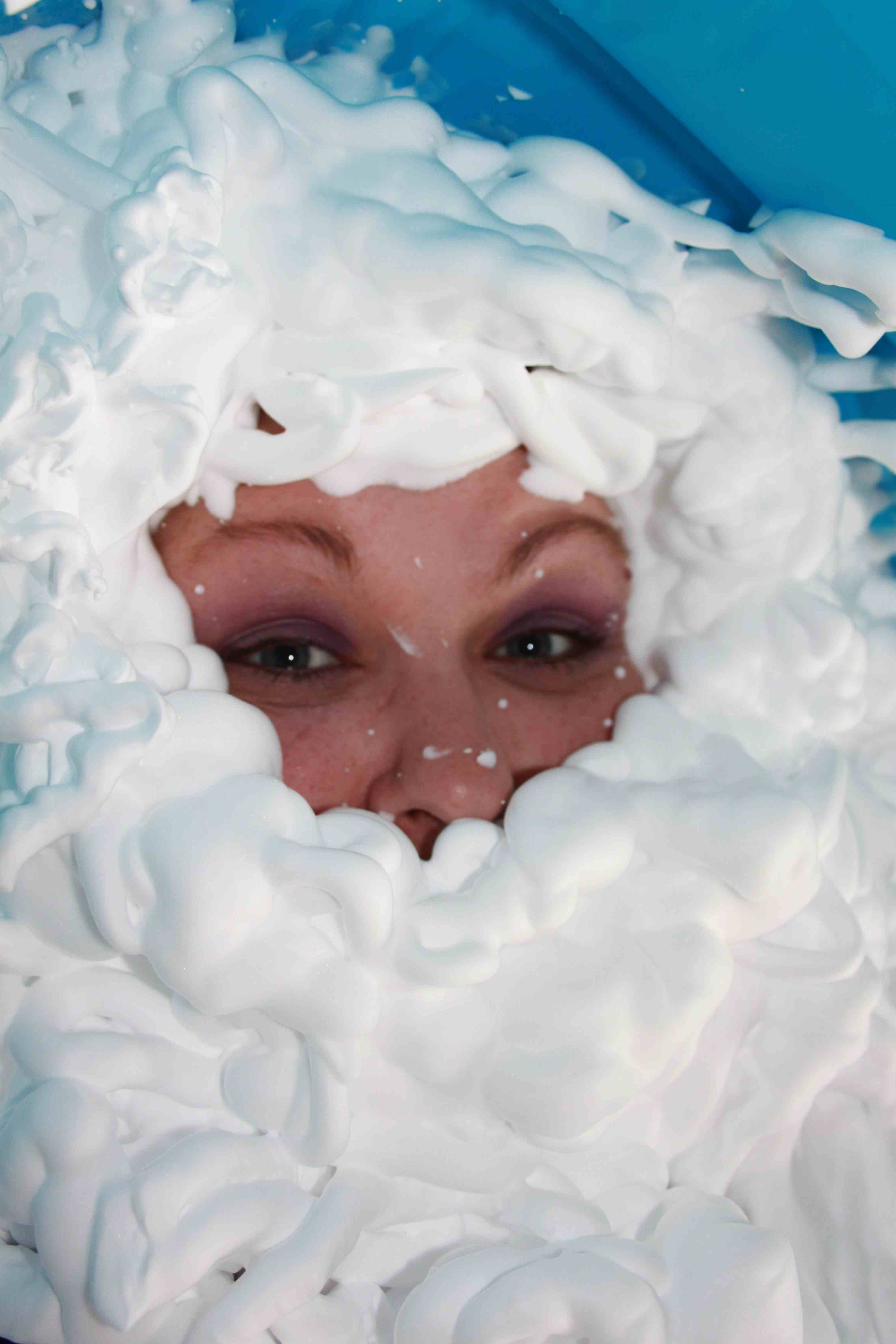 My friend and I have had numerous conversations about our WAM fantasies - he wanted to totally engulf a "damsel in distress", whereas I wanted to be engulfed in foam. So we devized a plan, got a pool and a ridiculous number of cans of shaving foam. The rest ain't exactly rocket science but was a lot of fun! I was bound by the feet, knees and wrists and made to lie down whilst he smothered the foam over my lovely velvet dress and opaque tights. After I was untied, we had a bit of a tussle in the foam with more than a few dodgy wrestling moves, the fiend! Here's a couple of teaser pics, rest will follow once I've got them on disc.