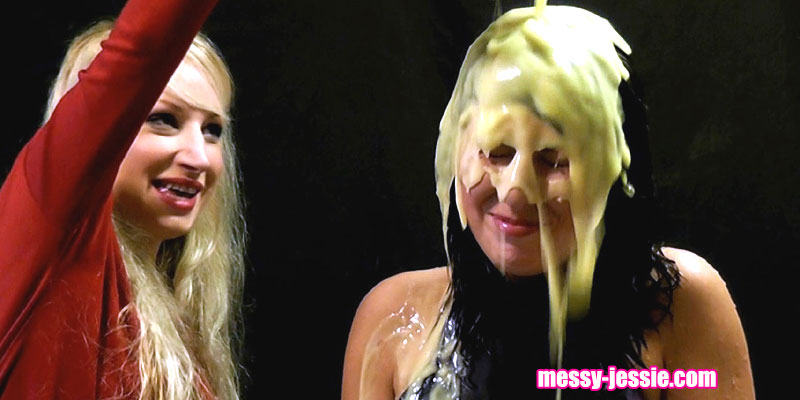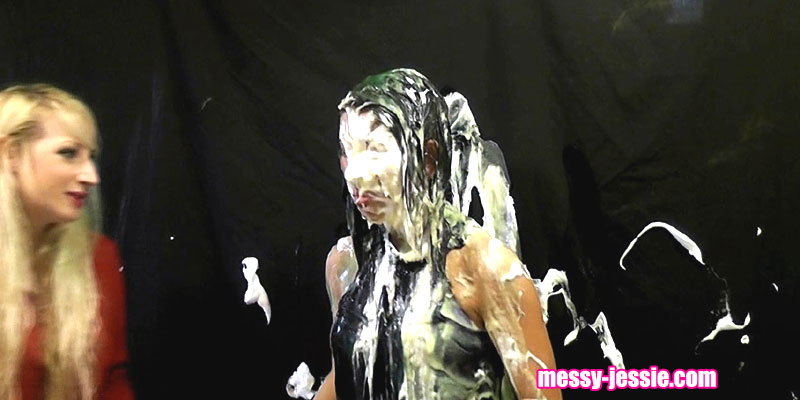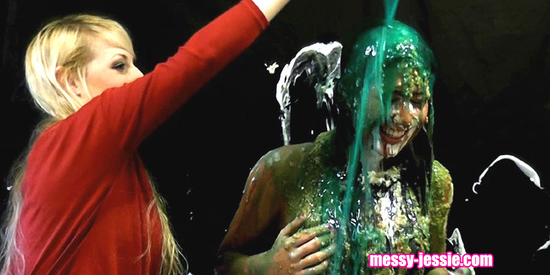 Our new model DeDe has her first sploshing experience! See how she takes blue slime, porridge, green gunge and a nice big custard pie in the face followed by some really nasty stuff...