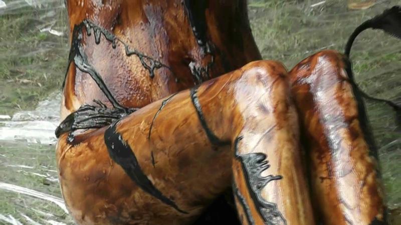First I rub in lotion all over and then pour on black treacle. I then pour over baby oil so I am really sticky and slimey! Then I add some black paint and flour. It made such a wonderful mess, and fabulous sensation,I would highly recommend it!