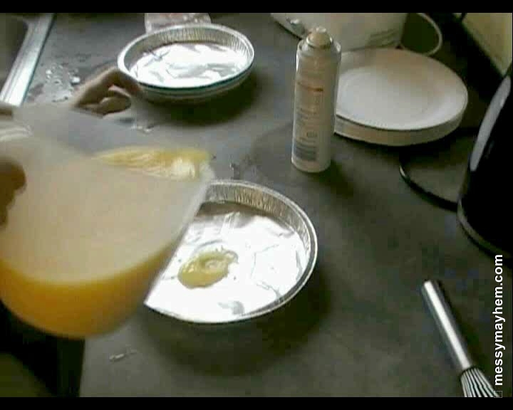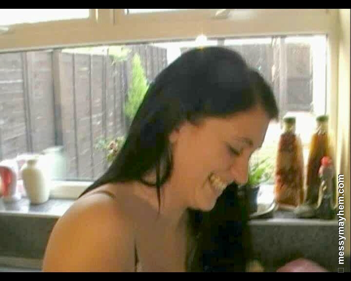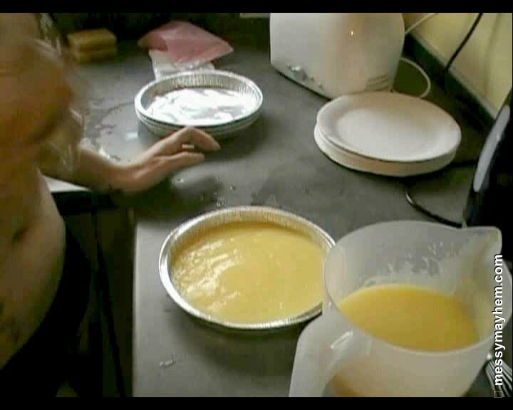 This is something a bit different from Messymayhem.com we’ve decided to move into the information film market with Brook presenting her “how to” on pies. Firstly Brook demonstrates making some pies in the kitchen and Valerie Singleton she most definitely is not! She then proceeds to demonstrate “smooching” of the pies upon her target the only too willing Messy Jessie. Brook is far more at home here and bosses Jessie around telling her to “get on her knees” and “get her tits out” which Jessie dutifully does we then have a countdown before the first pie is delivered to Jessie’s eager face. This is followed up by a couple more pies. Jessie is not terribly impressed by Brook’s pieing technique and lets her know this. That’s not the cleverest idea though as Brook produces a bucket of cold custard that was “left over” from making pies and proceeds to tip it over Jessie while Rose makes a quick appearance with a couple of cans of shaving foam to top Jessie off as she is turned into a “Jessie pie”. This seems to get Jessie rather excited as she sits afterwards rubbing the mess over her boobs, dribbling it into her panties and giggling. At the end I have included some super sexy slo mos from the other camera of Jessie rubbing the mess over her boobs.