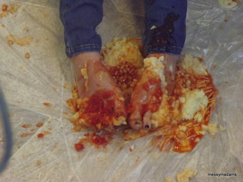 We used beans,mashed potato,porridge,spaghetti,tomato soup,tomato,tomato sauce, BBQ sauce, rice pudding and strawberry yoghurt.