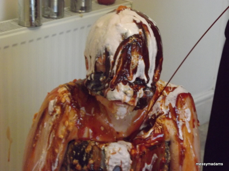 hi guys i decided to play guess the mess (competition were you have to guess what is being poured on your feet if you get it wrong it goes over your head) i was wearing a black and silver corset with blue jeans