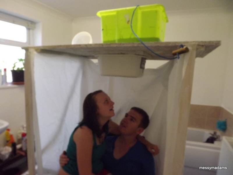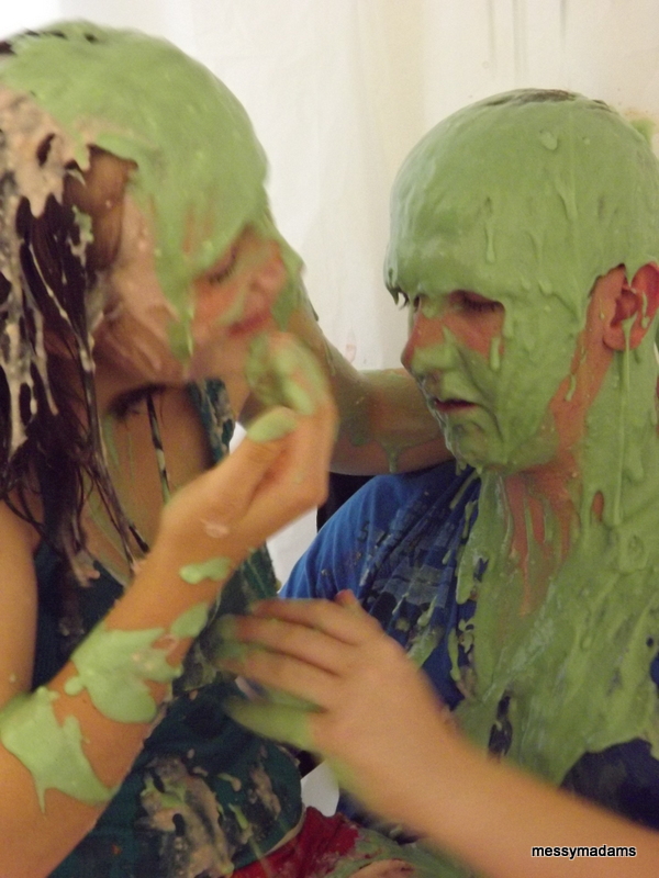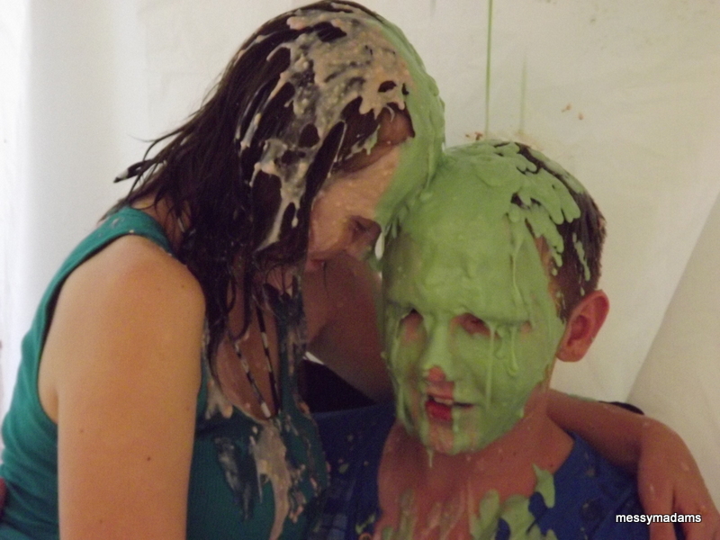 I then notices the rope that holds all the cake batter above our heads and together we pull the rope that then covers us in the green batter then we have water poured over us and left-overs from the previous video.