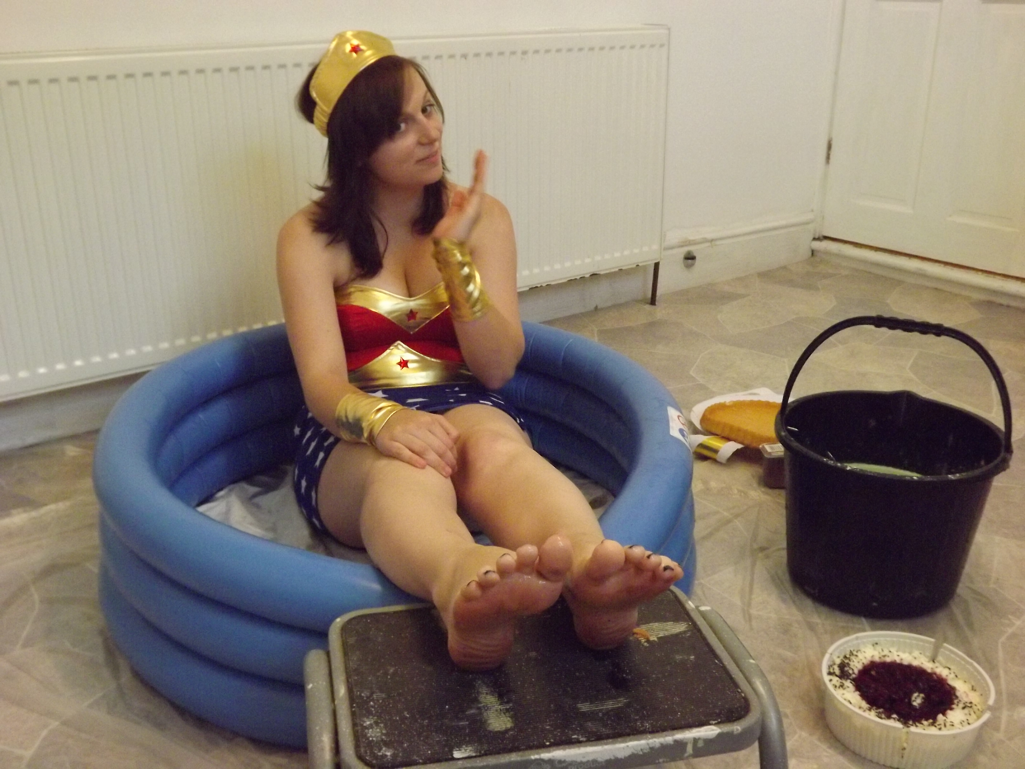 hi guys another new video well here i am in my wonder women outfit and because you wonderful people would like to see my feet being tickled well if i laughed once then i got a chocolate pie in the face and if i was laughed twice i ended up getting messy with cake batter yoghurt and chocolate mousse