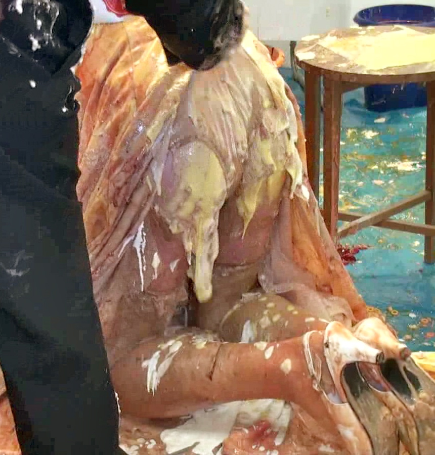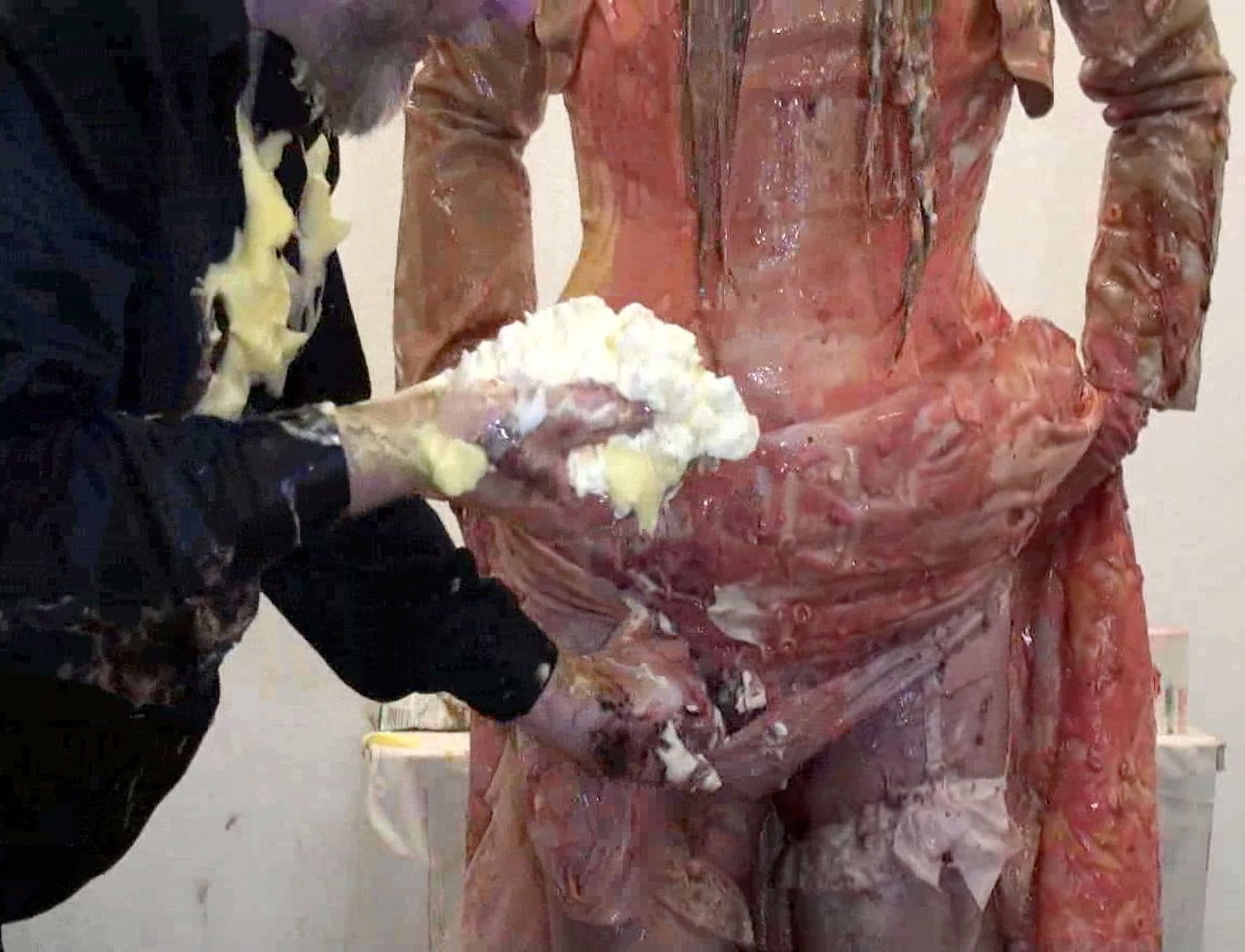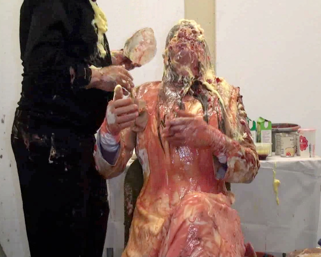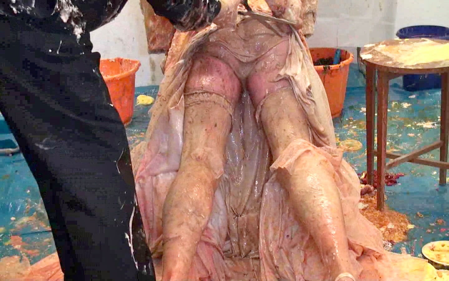 Next whilst that soaked in...time for a bucket of porridge over the head to destroy the wig, Then it's back on the floor for our once immaculate satin-gowned girl as I cut open the back of her dress to allow nice easy access to the back of her knickers. In there I put a whole banoffee pie and yet more custard and cream to add to the trifle at the front till they practically sagged to her ankles. Seems Lou needs a little help holding them up so time for a massive messy wedgie!