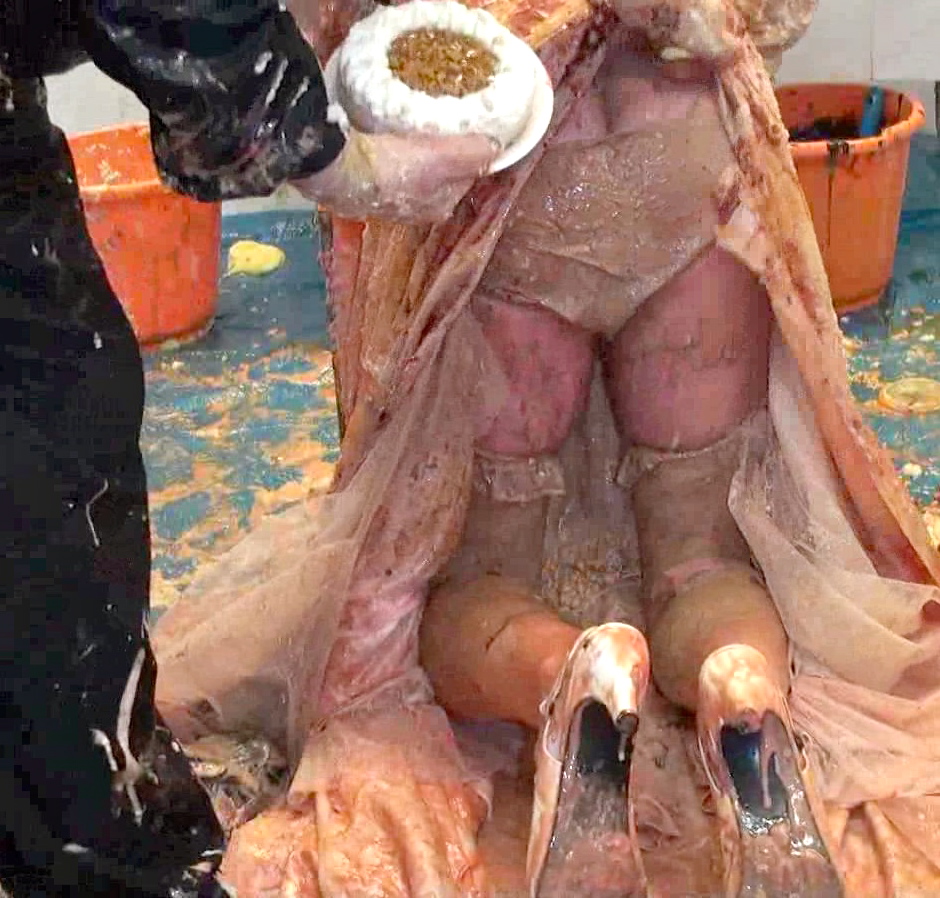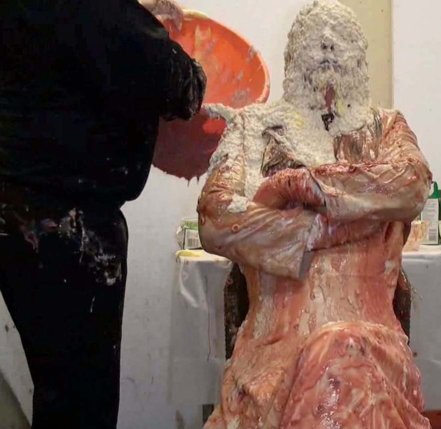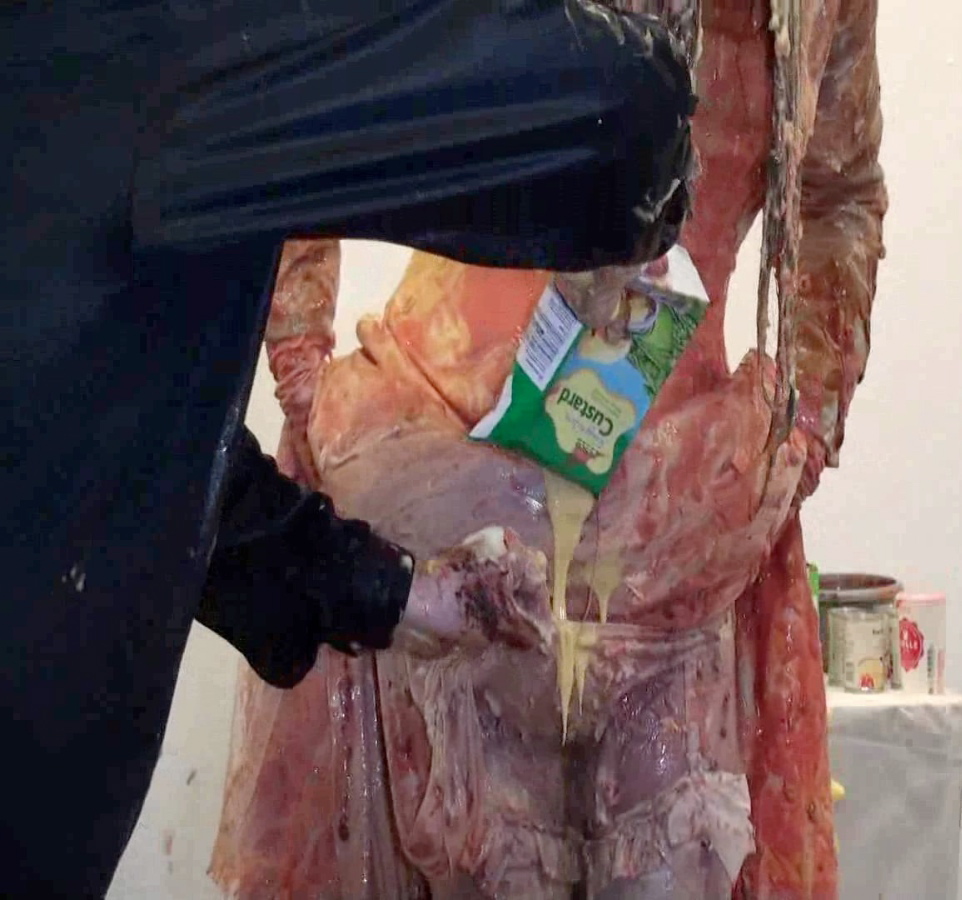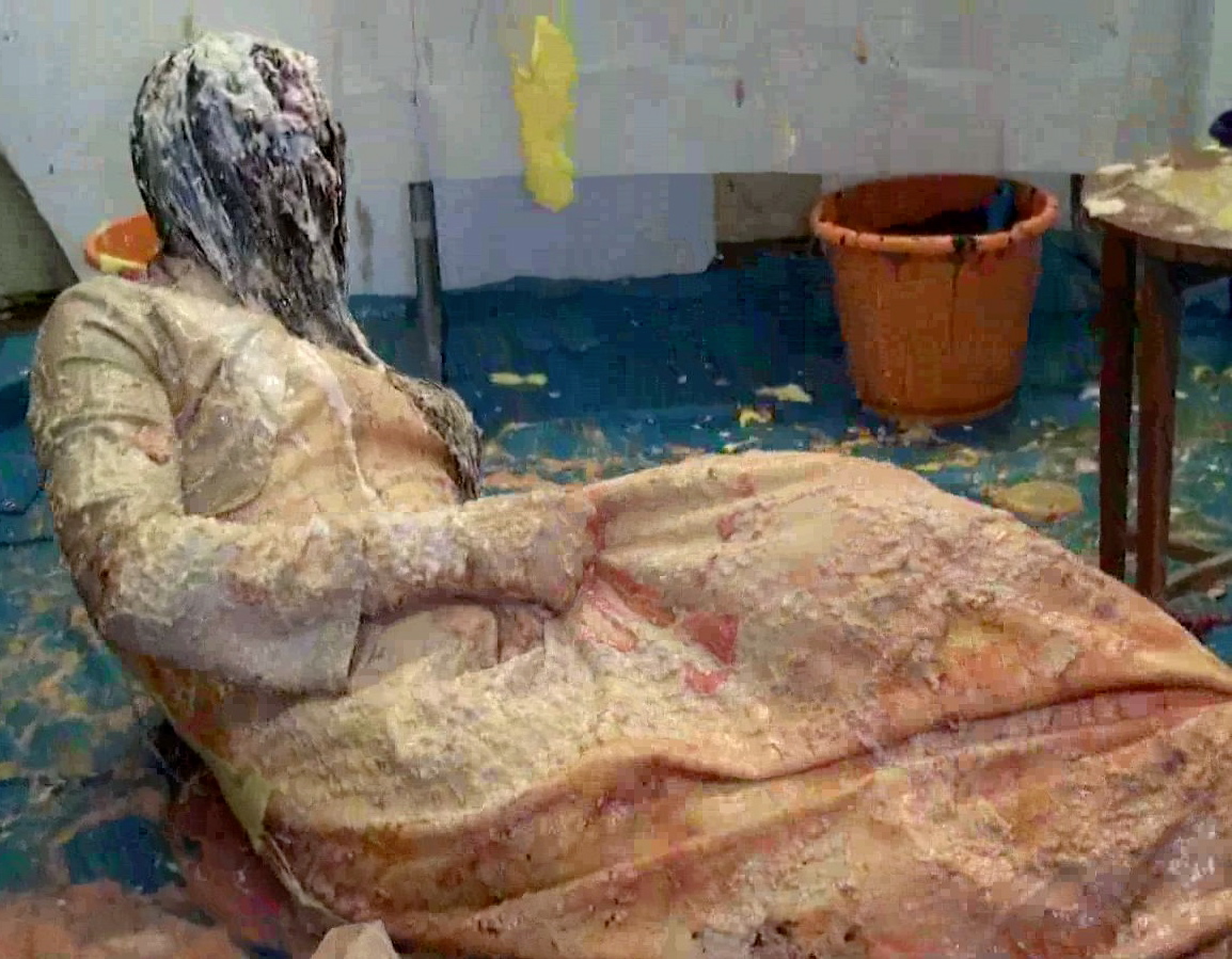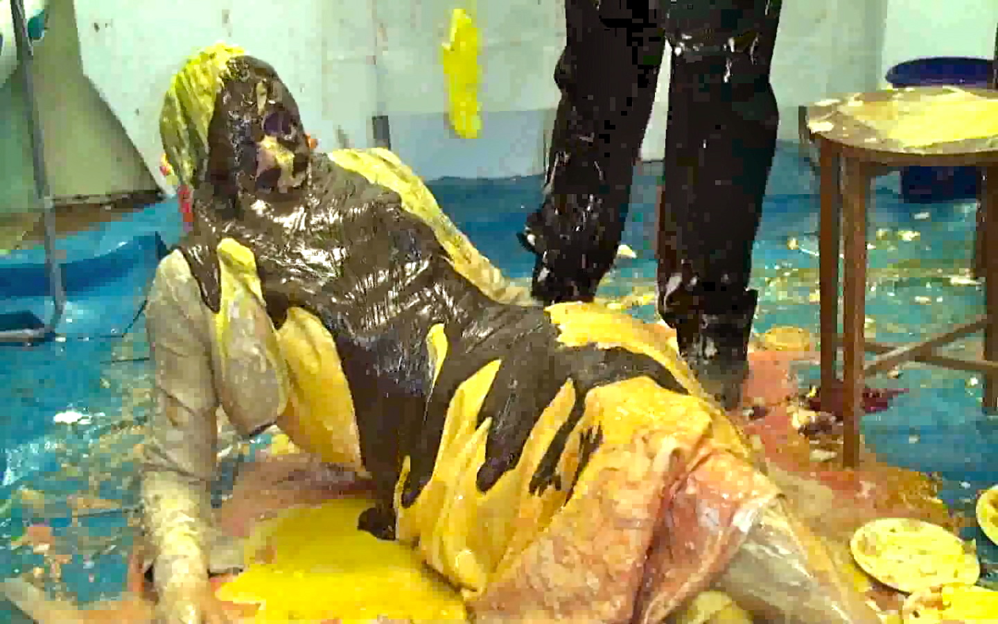 Next whilst that soaked in...time for a bucket of porridge over the head to destroy the wig, Then it's back on the floor for our once immaculate satin-gowned girl as I cut open the back of her dress to allow nice easy access to the back of her knickers. In there I put a whole banoffee pie and yet more custard and cream to add to the trifle at the front till they practically sagged to her ankles. Seems Lou needs a little help holding them up so time for a massive messy wedgie!