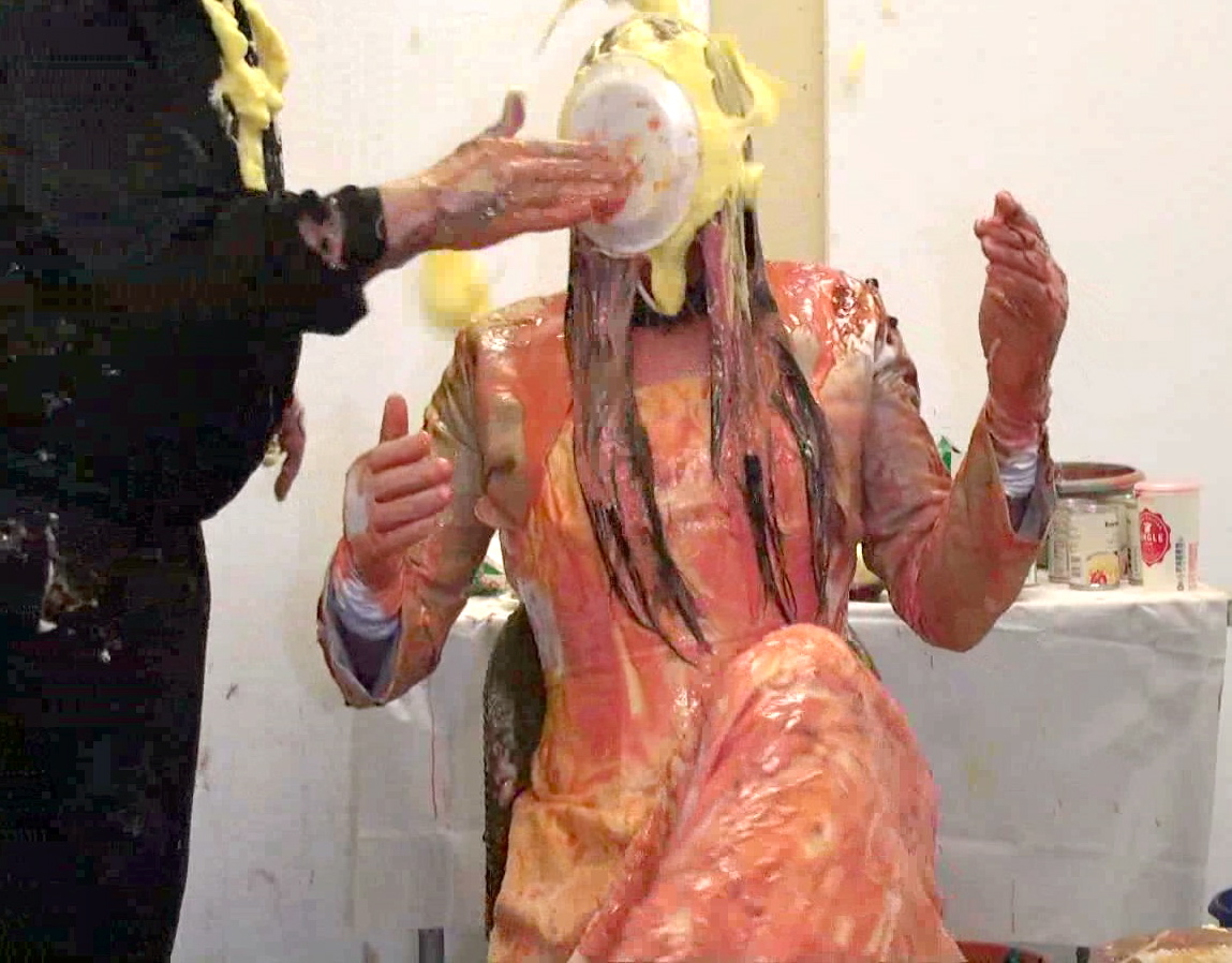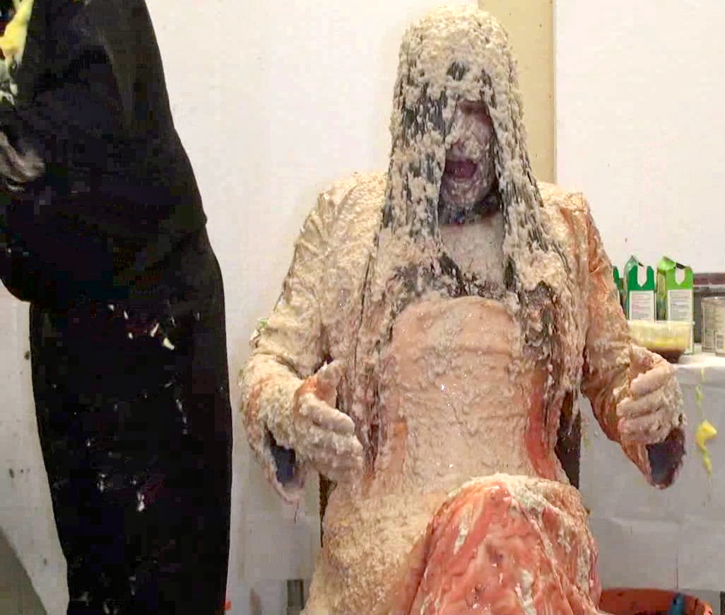 The final part of Messy Lou's destruction.... and after yet another swift foam pie to the face (my excuse was to 'maintain anonymity!), it's a full trifle facial! Then another portion goes down the front of her panties - washed down with custard.