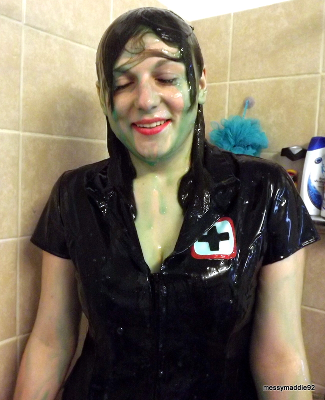 In this Video I am sat in the gunge tank wearing my pvc nurse outfit knee high boots and stockings with blue gunge above i tell the camera how the pvc looks and feels on my skin i then get gunged in blue followed by green gunge