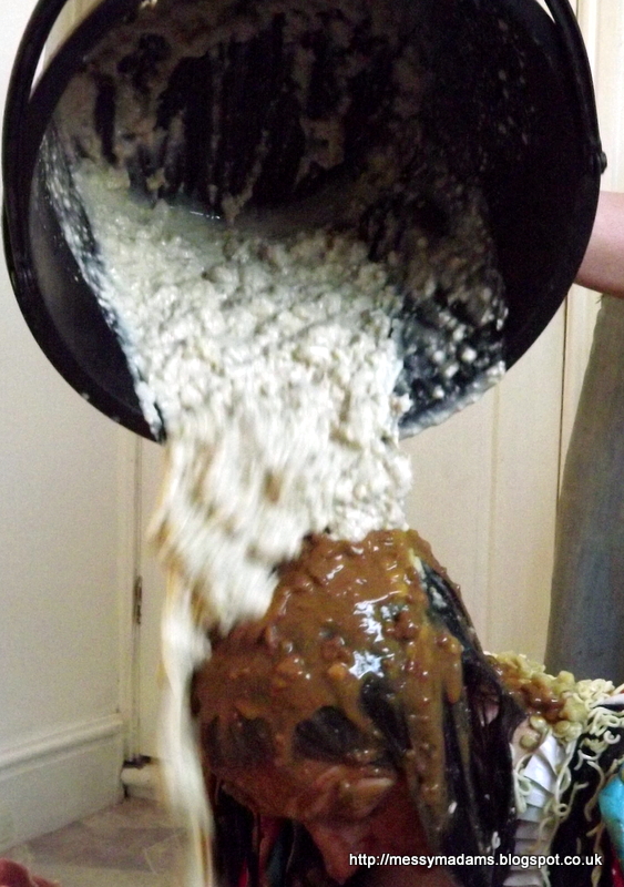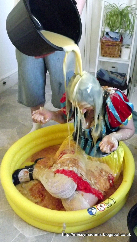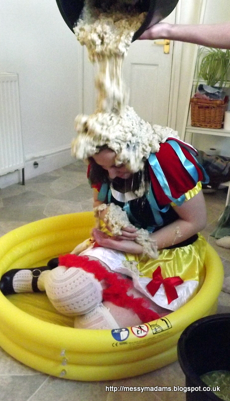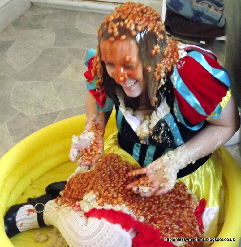 In this video Maddie is wearing her snow white outfit complete with white knee high socks and little black heels as she sits in the pool she finds 7 buckets outside of the pool these include beans,mushy peas,gravy,porridge,mash potato,chicken noodles and finally custard. these were all poured over Maddie's head one by one by Wamrocker who came to assist us with a male wam project.