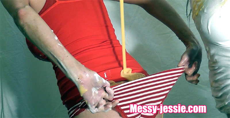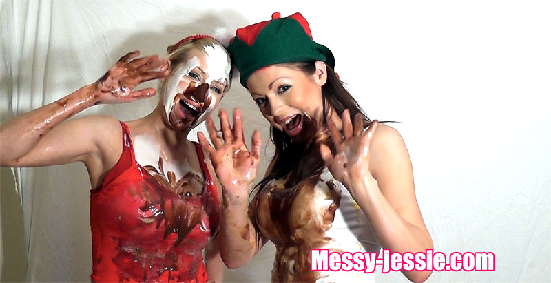 I play the role of Santa and Miah is my Christmas Elf! Miah has never done stocking filling before, now we all know that stocking filling is an essentioal part of being a Christmas elf, but also a memeber of the Messy Jessie gang! So I fill her stockings with stuffing, gravy and cranberry sauce and then she does the same for me. After the main course, it's time for pudding! We fill each others stockings with mincemeat, brandy sauce (oh my god yummy!!) chocolate and custard!