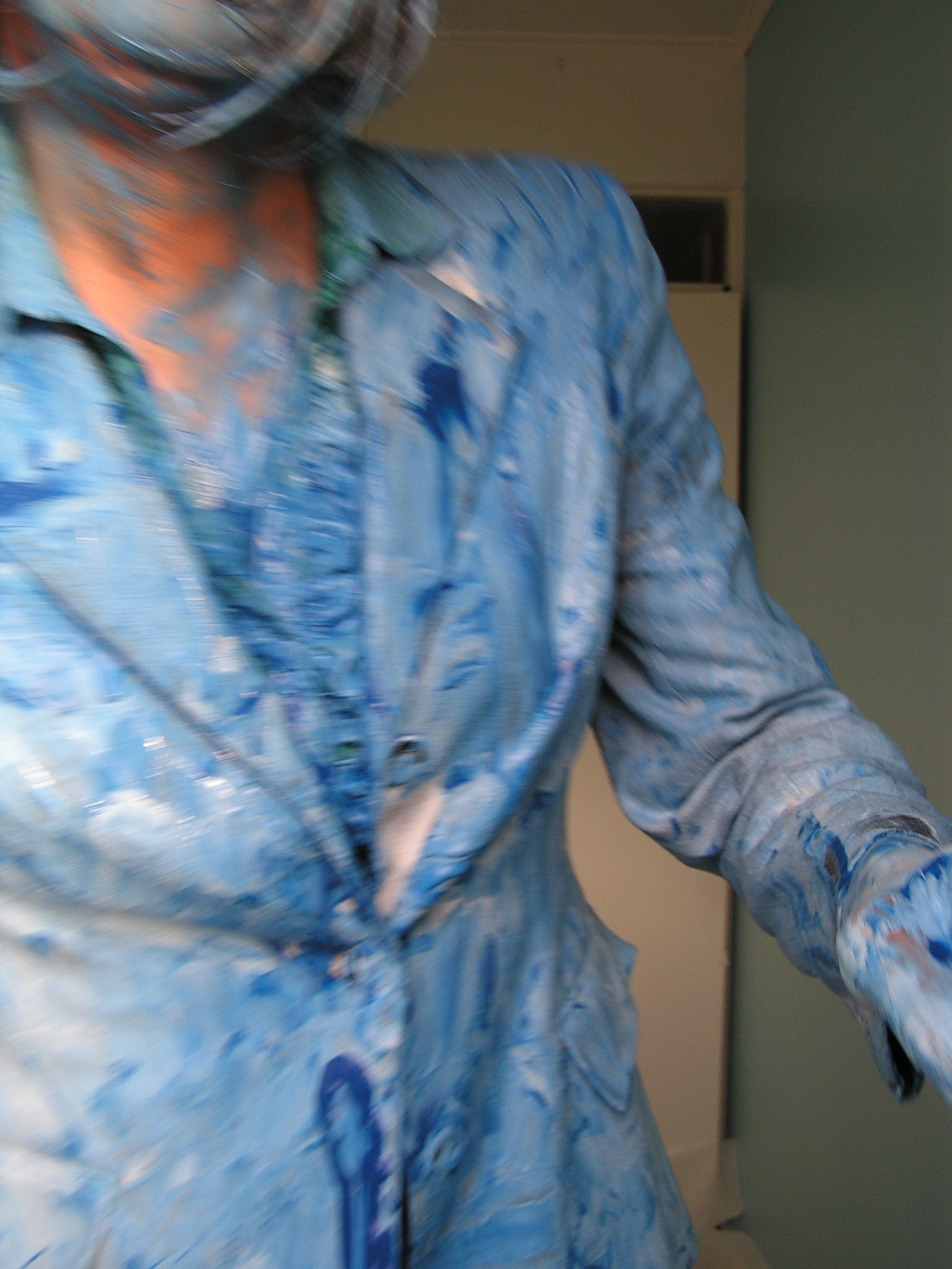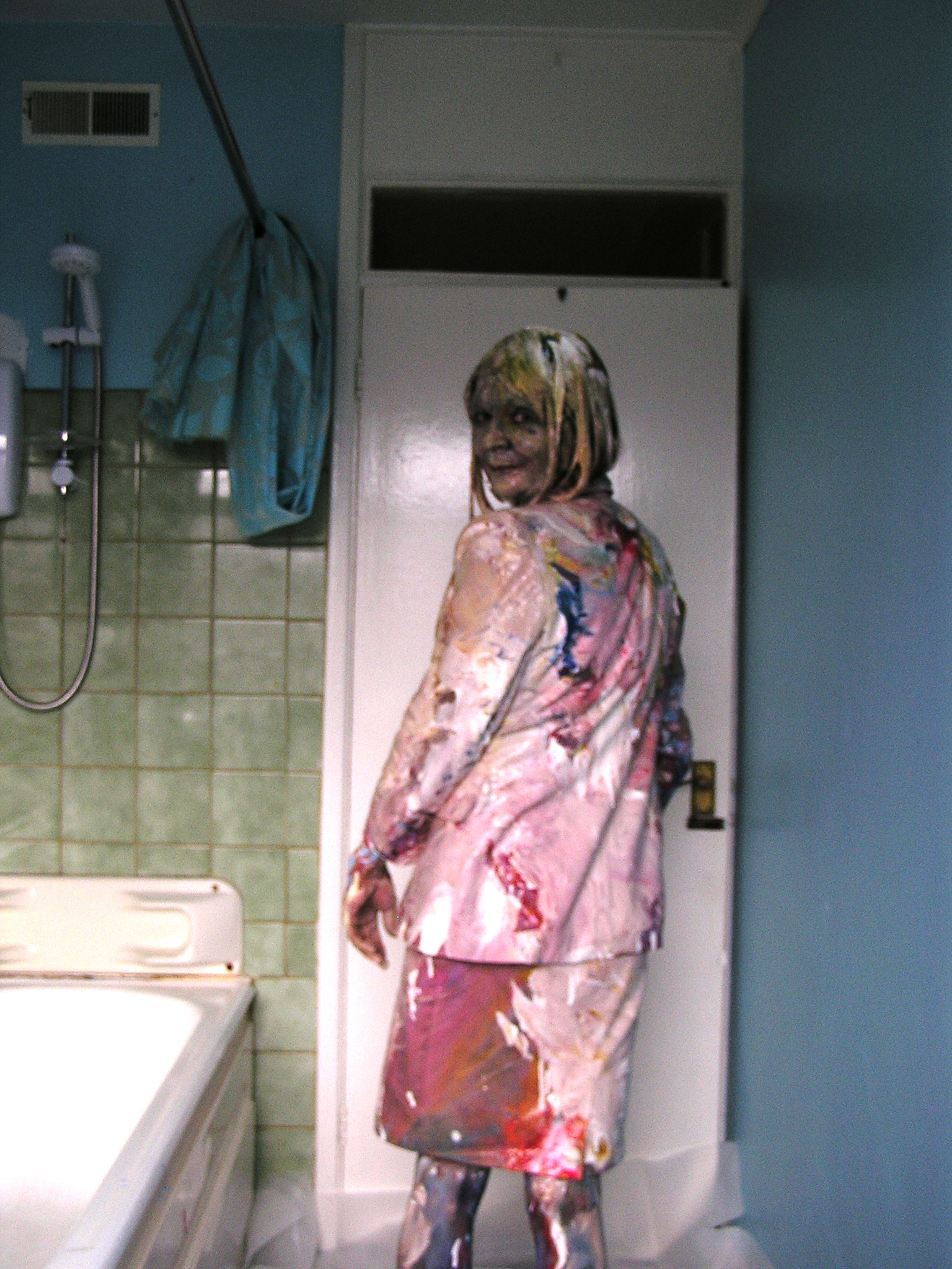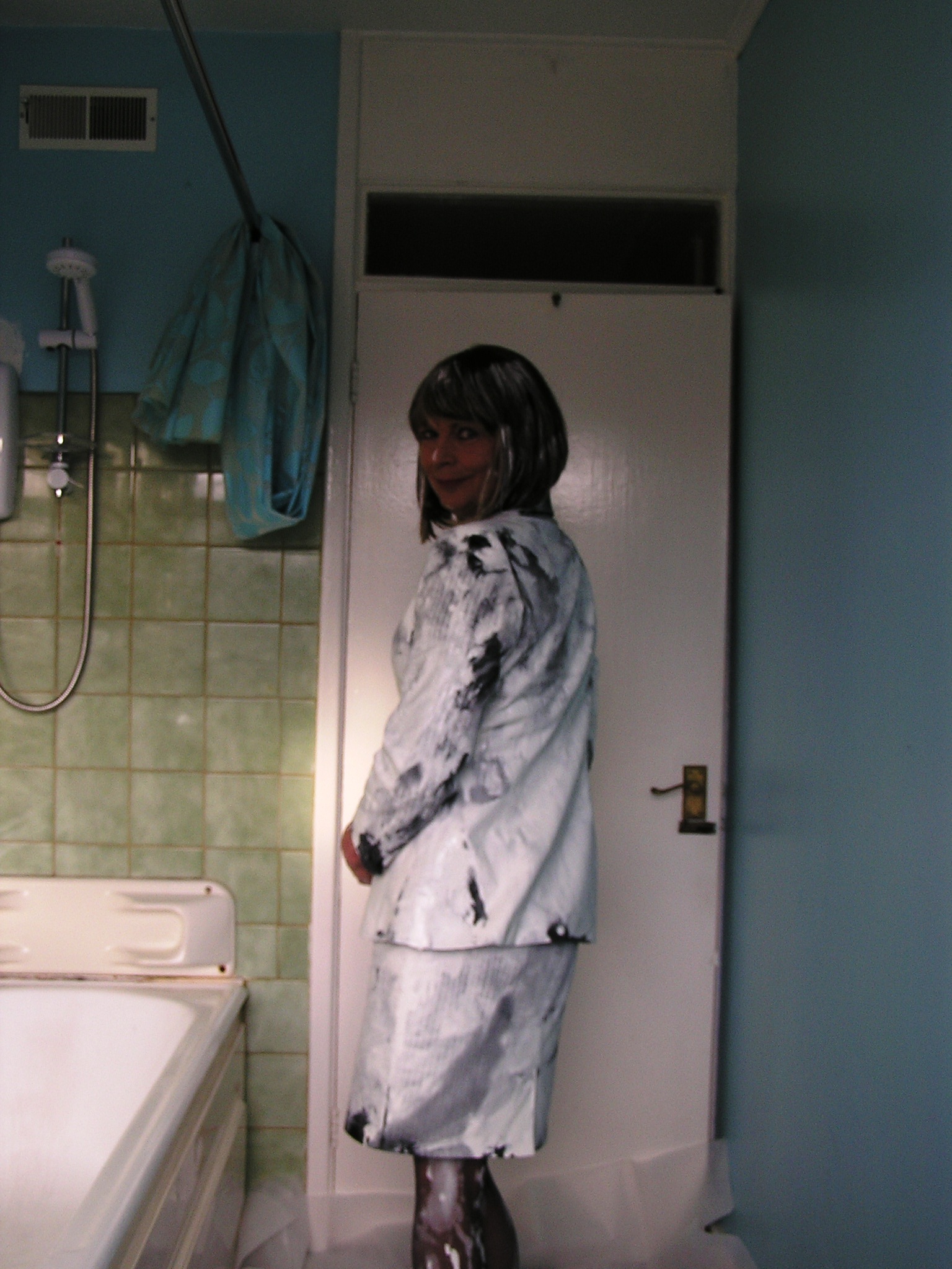 First a coat of white emulsion paint over my suit and then blue,red and yellow poster paint to create a multi-coloured Jo.Finally another coat of white paint to leave one painted lady!!