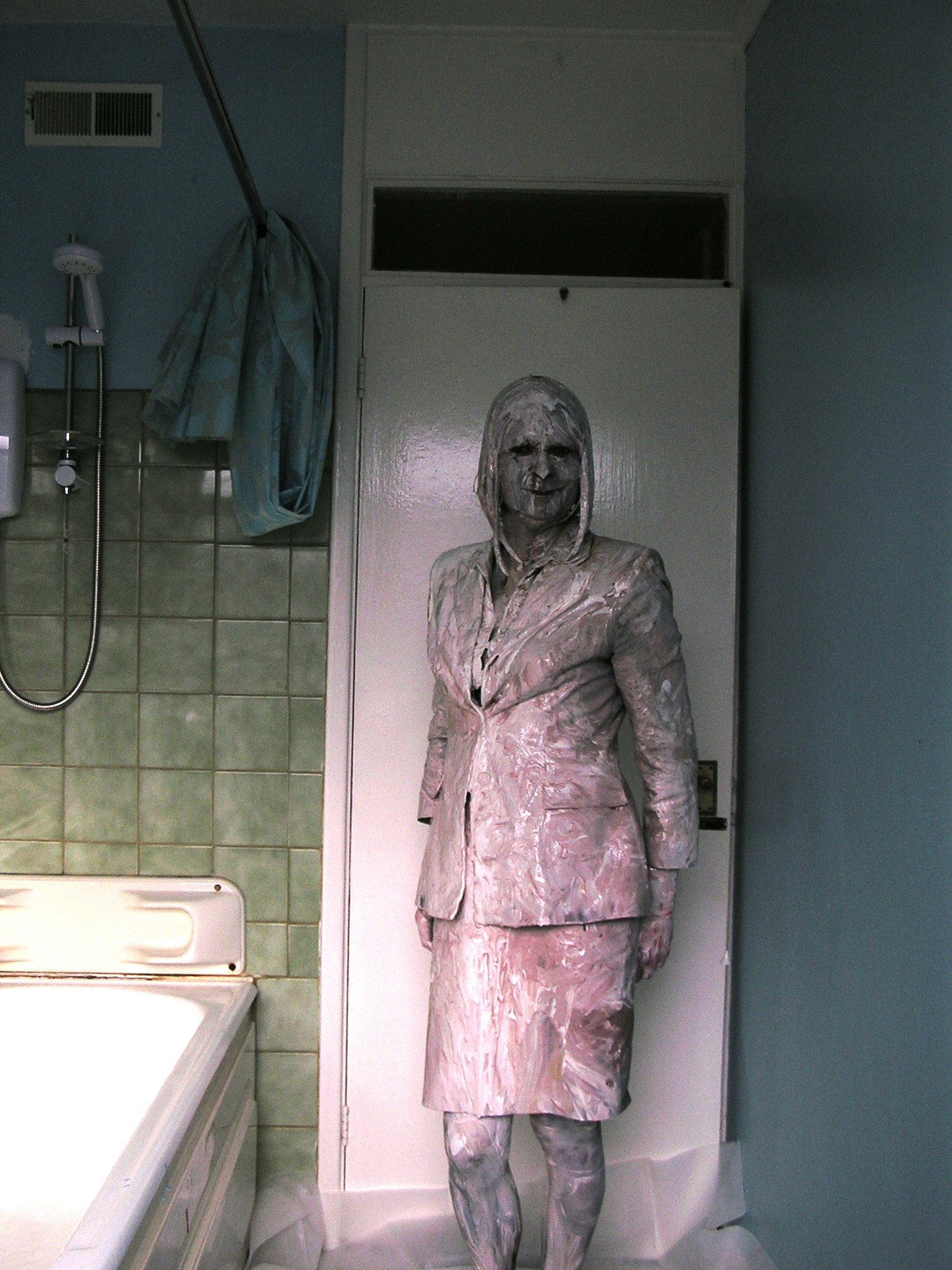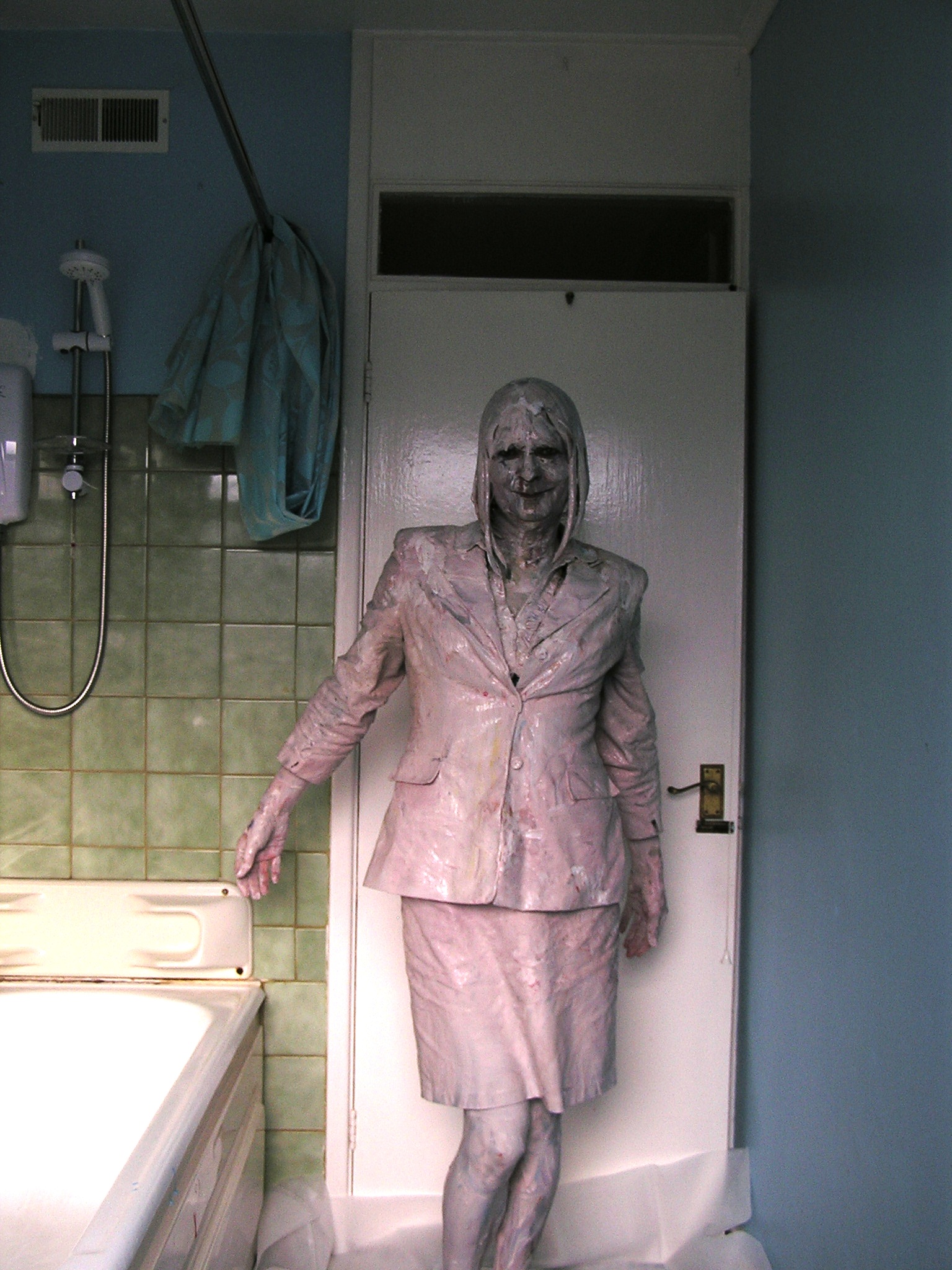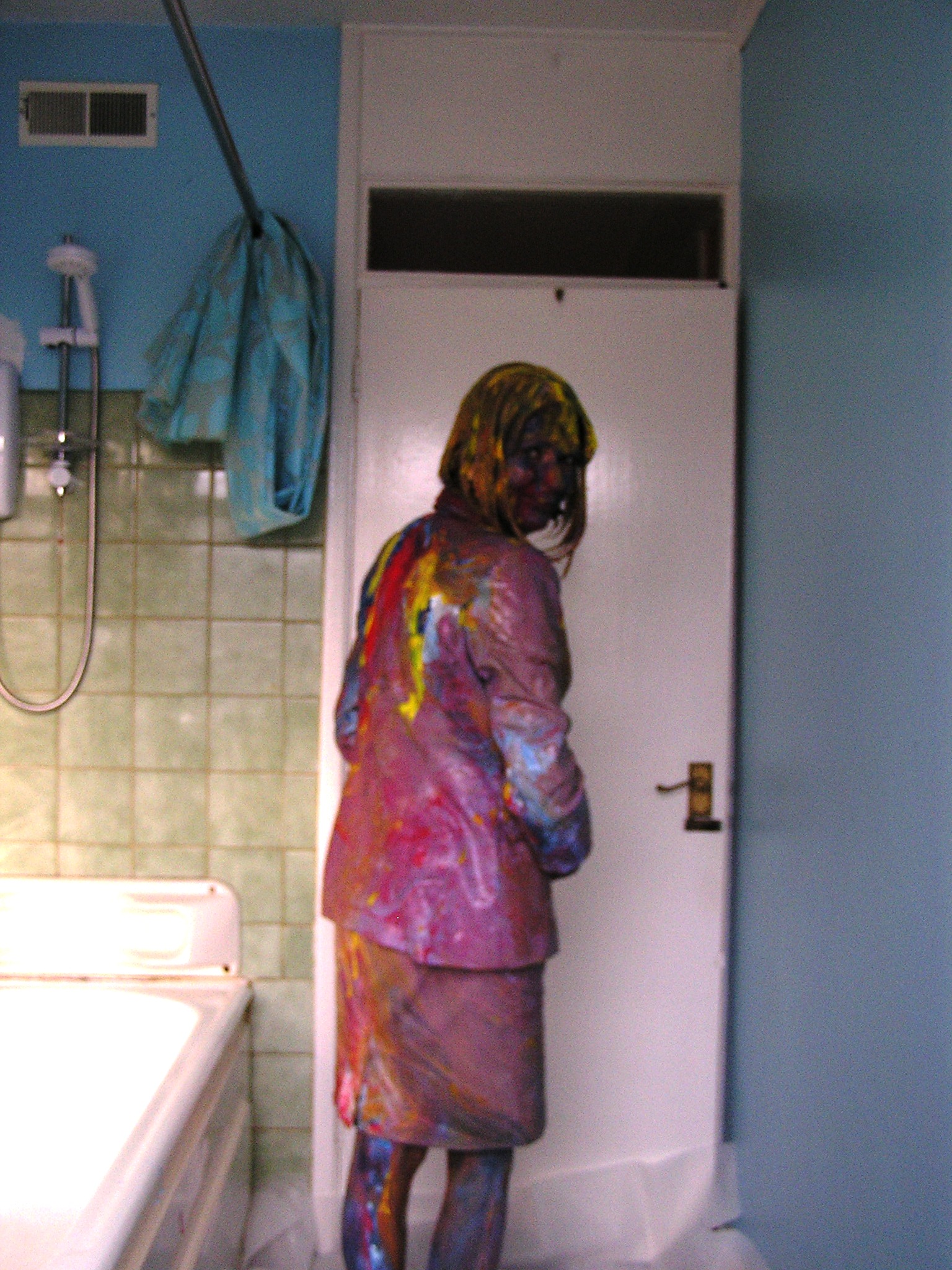 First a coat of white emulsion paint over my suit and then blue,red and yellow poster paint to create a multi-coloured Jo.Finally another coat of white paint to leave one painted lady!!