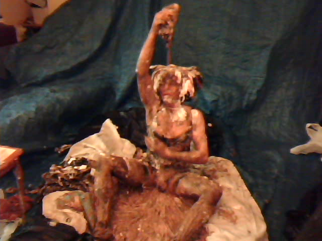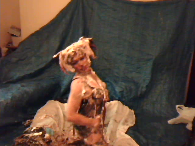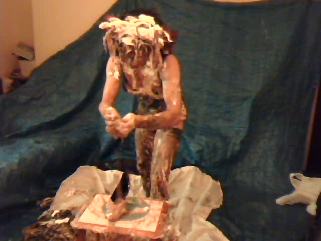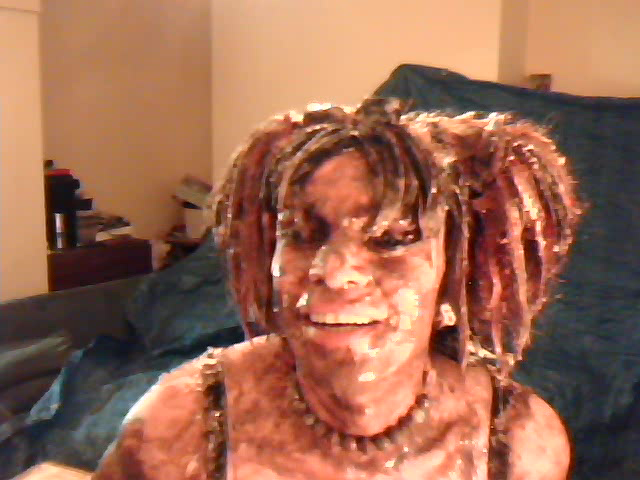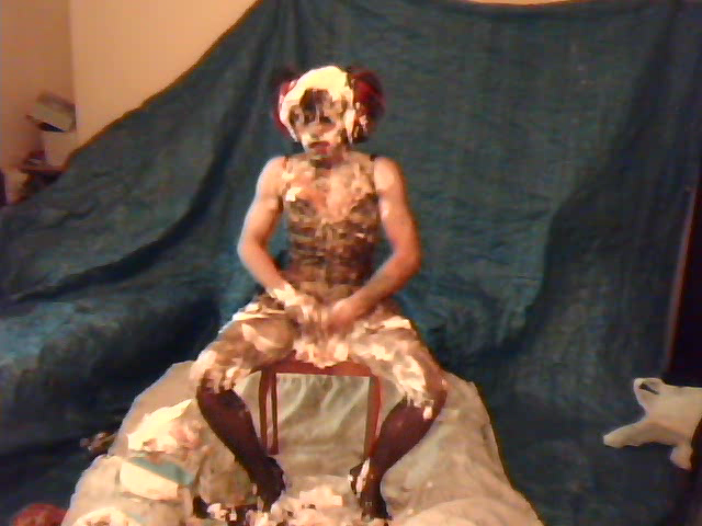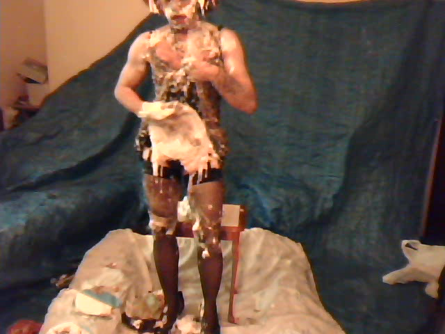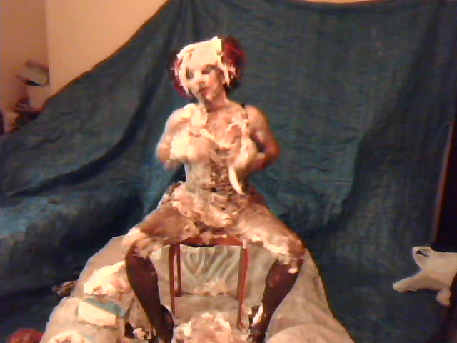 Dressed in a short black n white skirt,black top,stockings & sexy lace basque & panties,& stilettos I start by pushing a large chocolate gateau into my face,followed by several pink blancmange & foam pies.As you can see it didnt take long for my nice clean clothes to get ruined by all the creamy foamy mess,the feel of all that gorgeous mess was soooo good being rubbed all over my body.