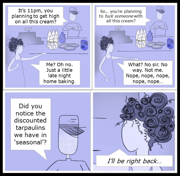 When shopping for food or clothes I have always wanted to be asked what I was buying them for. I wanted to see if I had the nerve to tell them the truth. Now I might have to!