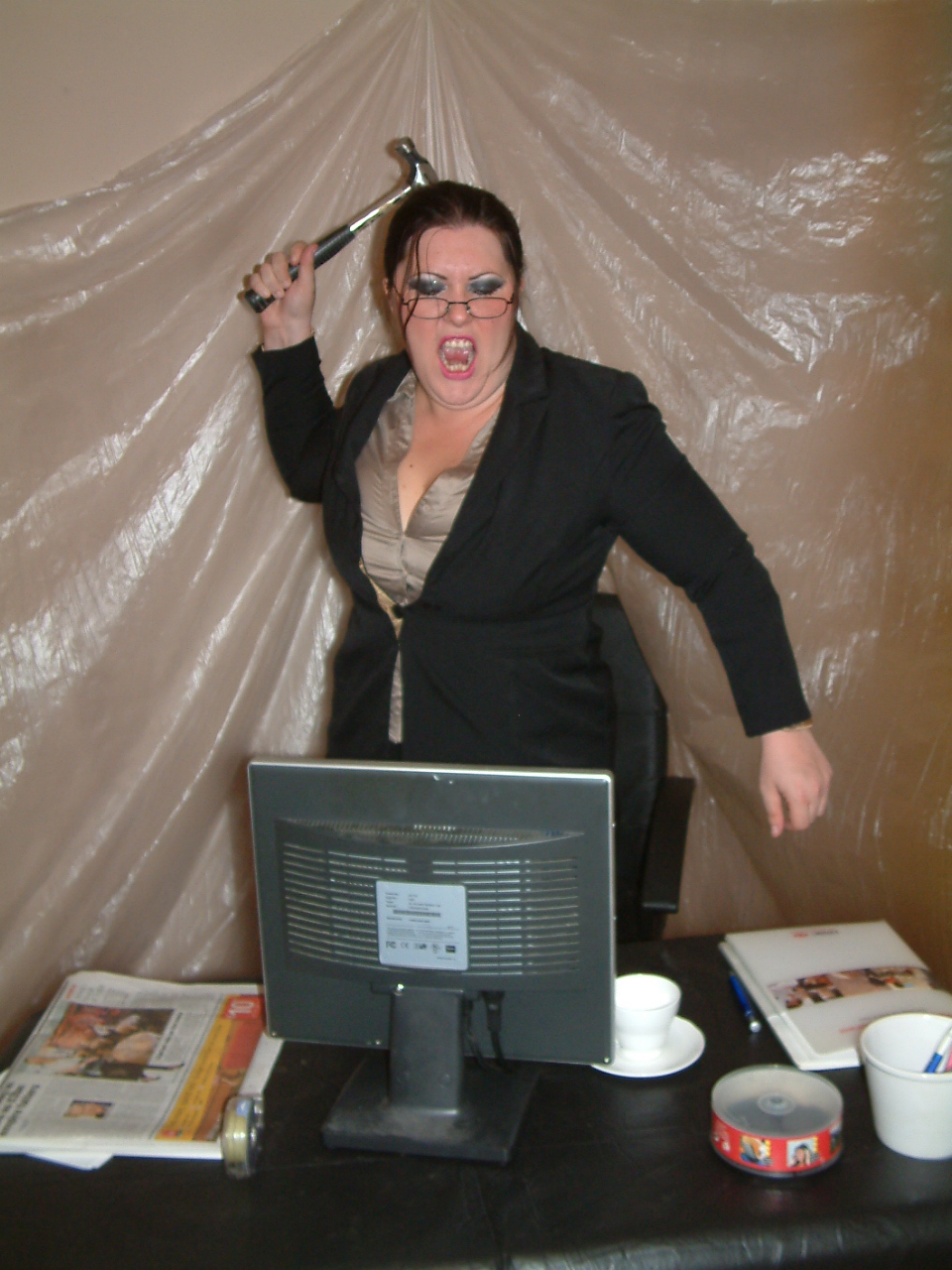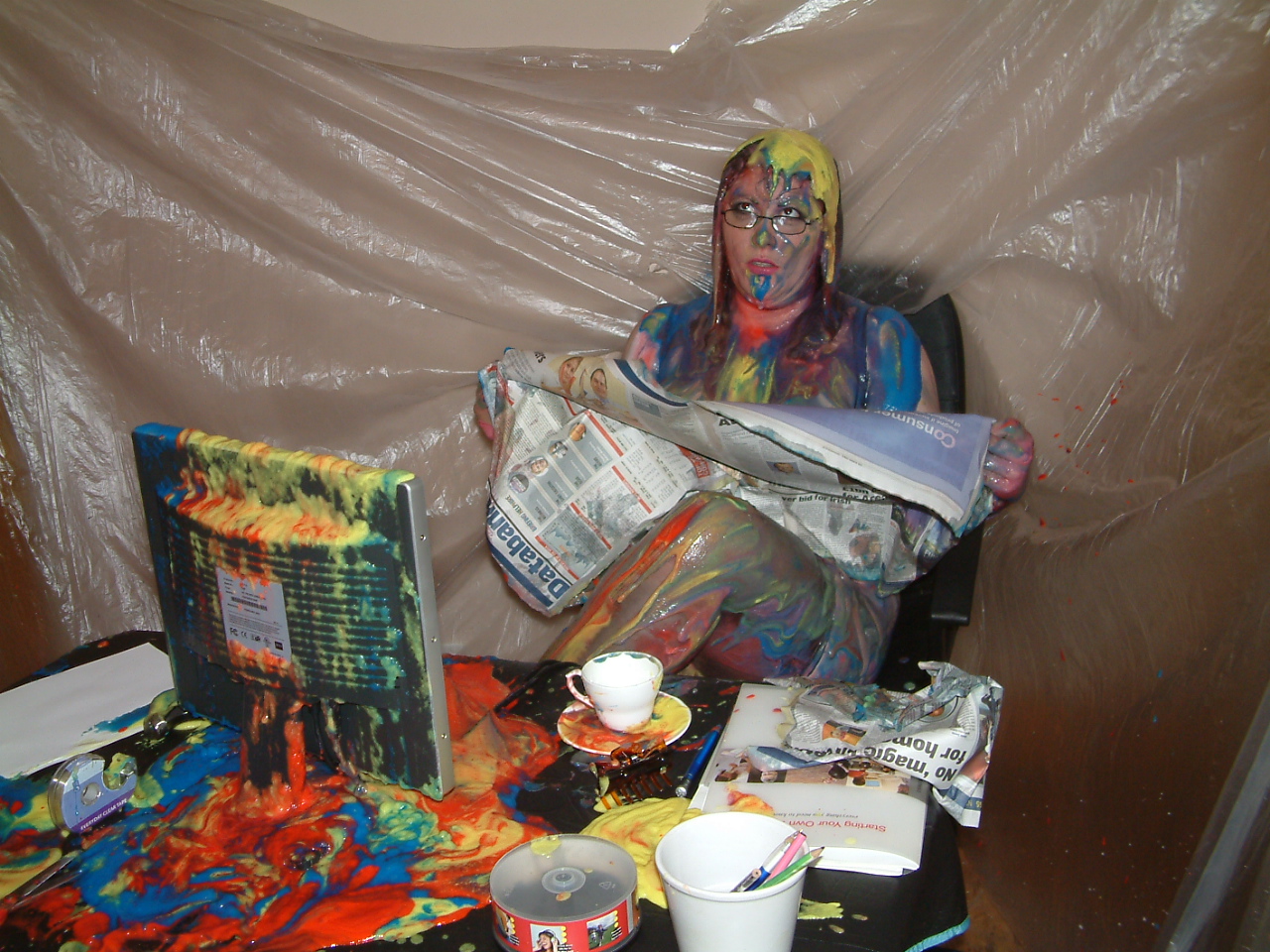 smash up your computer? ...how about gunging it, smashing it up then covering yourself in lovely slimey gunge and cutting and ripping your clothes off? hehe