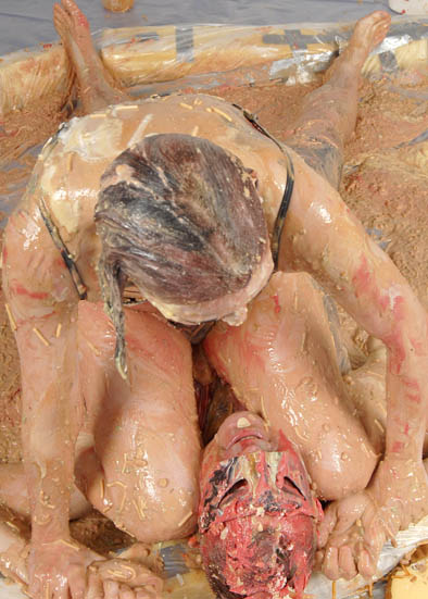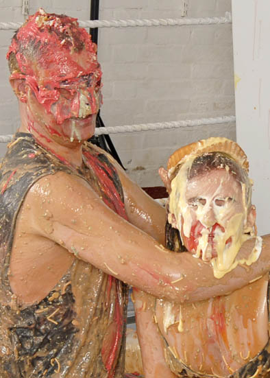Now on to the final round in this grudge match. Dynamo suprises everyone by moving in first, not with a wrestling hold but a pie full on in the Masked Man's face. The slapstick mayhem continues until Dynamo takes her chance and nails the Masked Man for her final winning pin. Remembering the gross gunging she got earlier she had little sympathy for the Masked Man and finished him off with her signature bean pour facial. THE END......