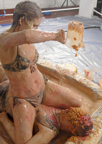 Muckypup - these pics were a test shoot as a prelude to our main FreeHouse set which will have Dynamo and Phoenix in the ring as we know you want to see some girl on girl action really. We attempted to potray a mix of messy wrestling and sploshing. In normal messy wrestling the ring is filled in advance so here half the beans/spaghetti were tipped in the ring in advance of the match to make up the messy wrestling pit. The rest in jugs and the pies were used as amo during the match. I know you all would have wanted us to tip the buckets over Dynamo before the grudge match began but to be honest I don't think after the mixed up slop going over her head the Masked Man would have got away with it lol.