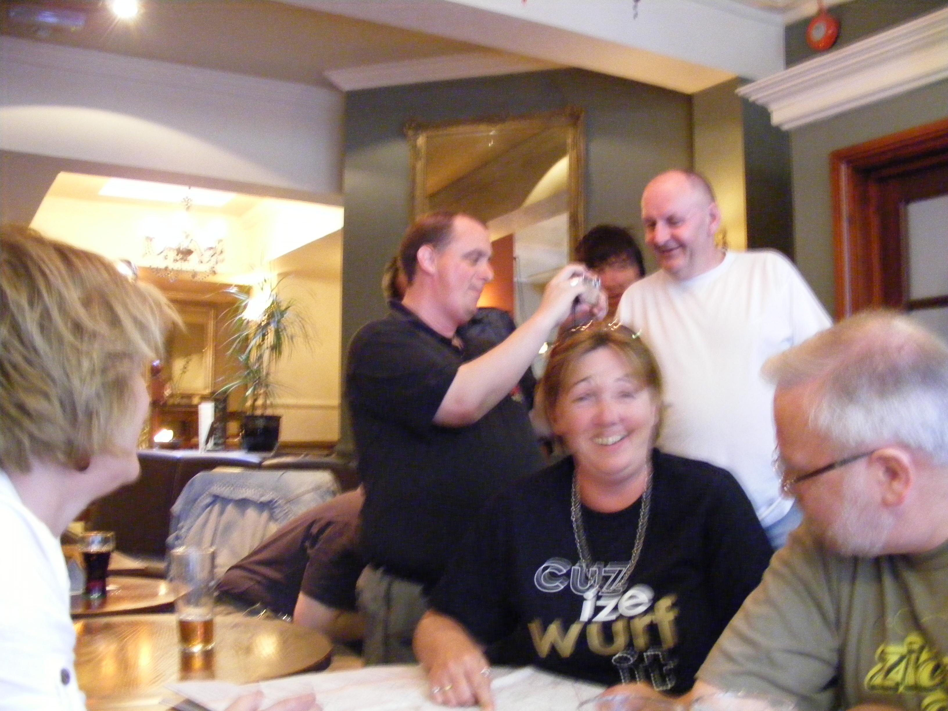 The afternoon progressed with pleasant chat and liberal quantities of alcohol, interrupted only by a topless bus, full of women (not topless), Darth Vader on a bike, scantily clad women, etc. until the eventual arrival of Sploshman indicated the close of the proceedings. After declaring an end to the formal(?) Meeting, Mike, our chairman led most of us to an Italian Restaurant for the festive board.