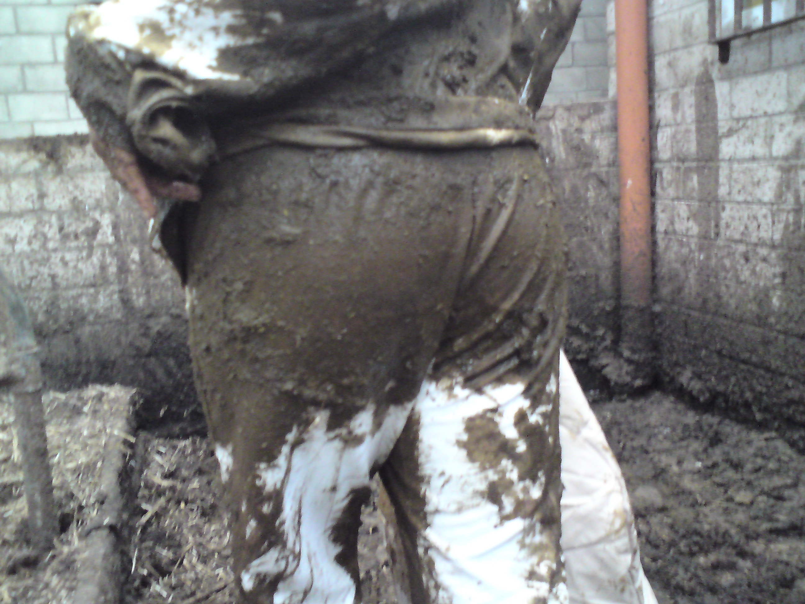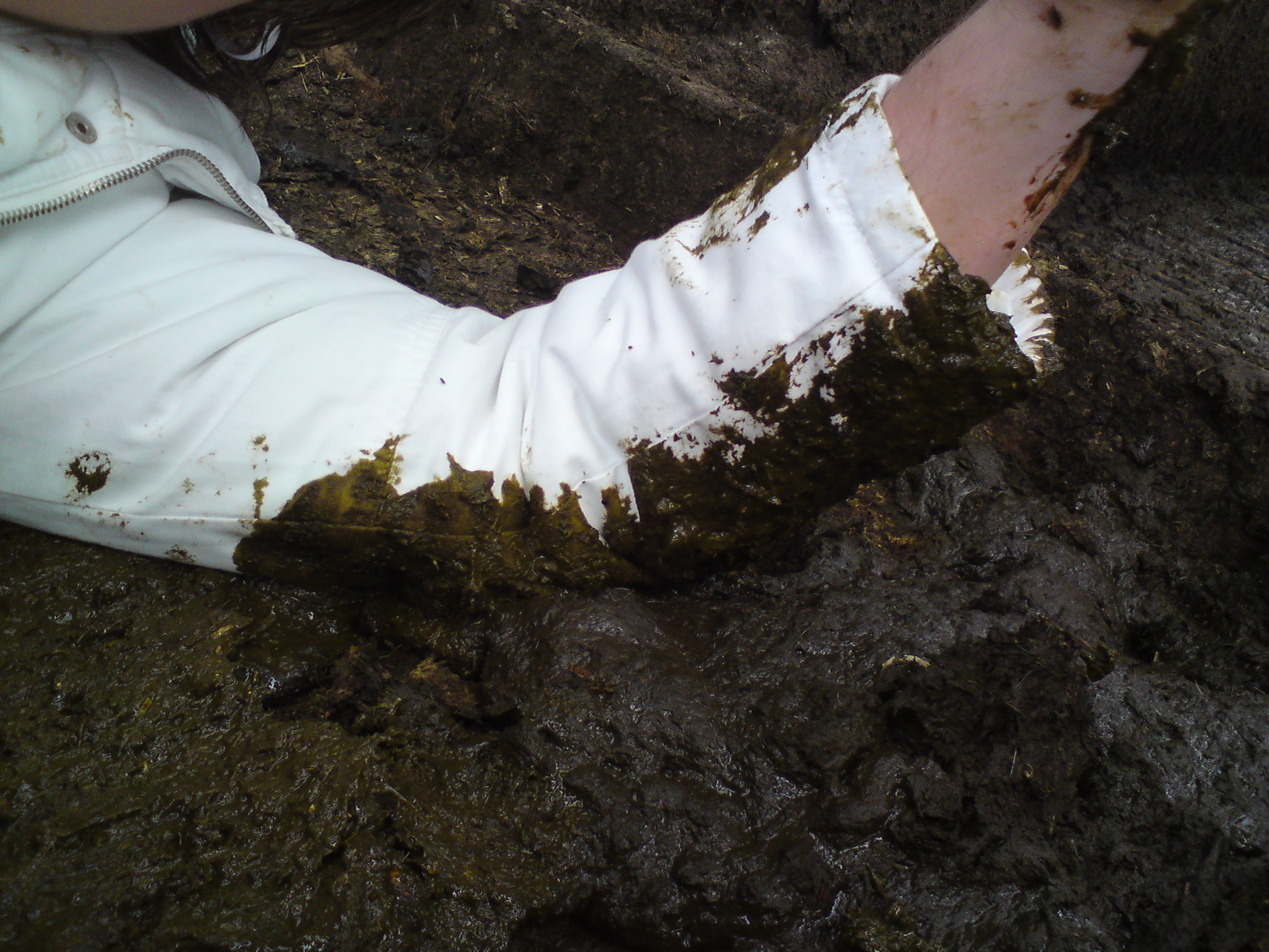 - the butt of a girl wearing skintight white leggings while crawling through cow patties in a cow shed after having sit down in a huge cow patty, later she already is as dirty as can be and shows her butt covered by the remains of her white jacket, then reveals her dirty butt by pushing away the hem of the jacket,