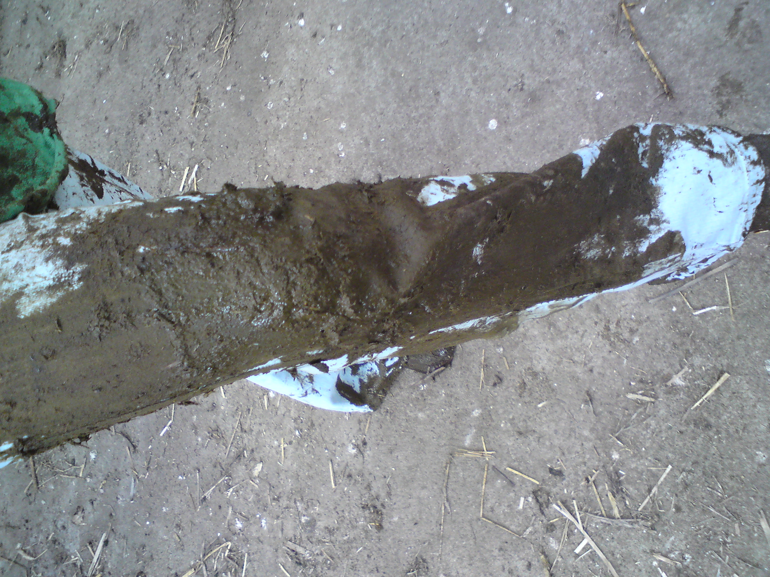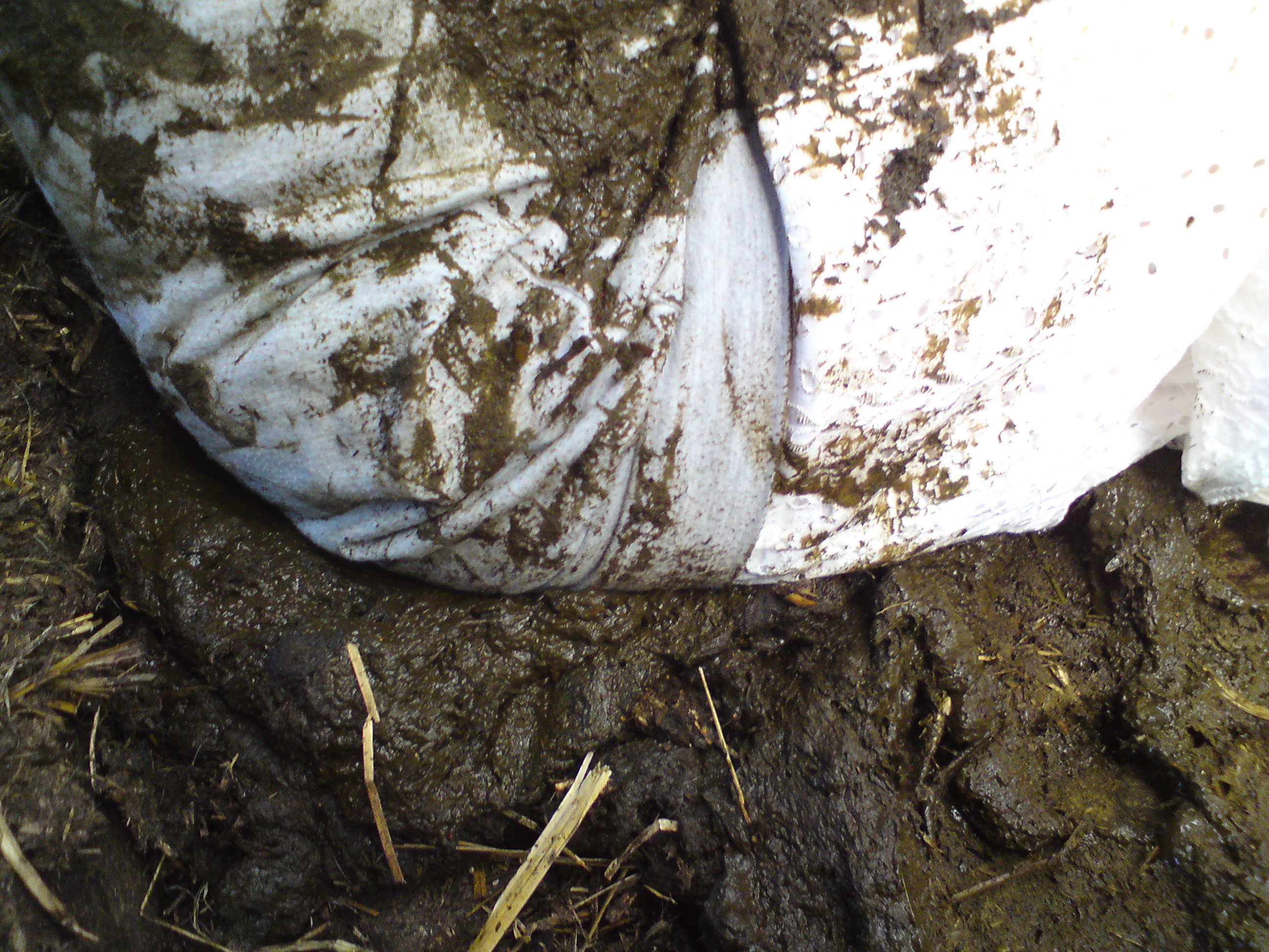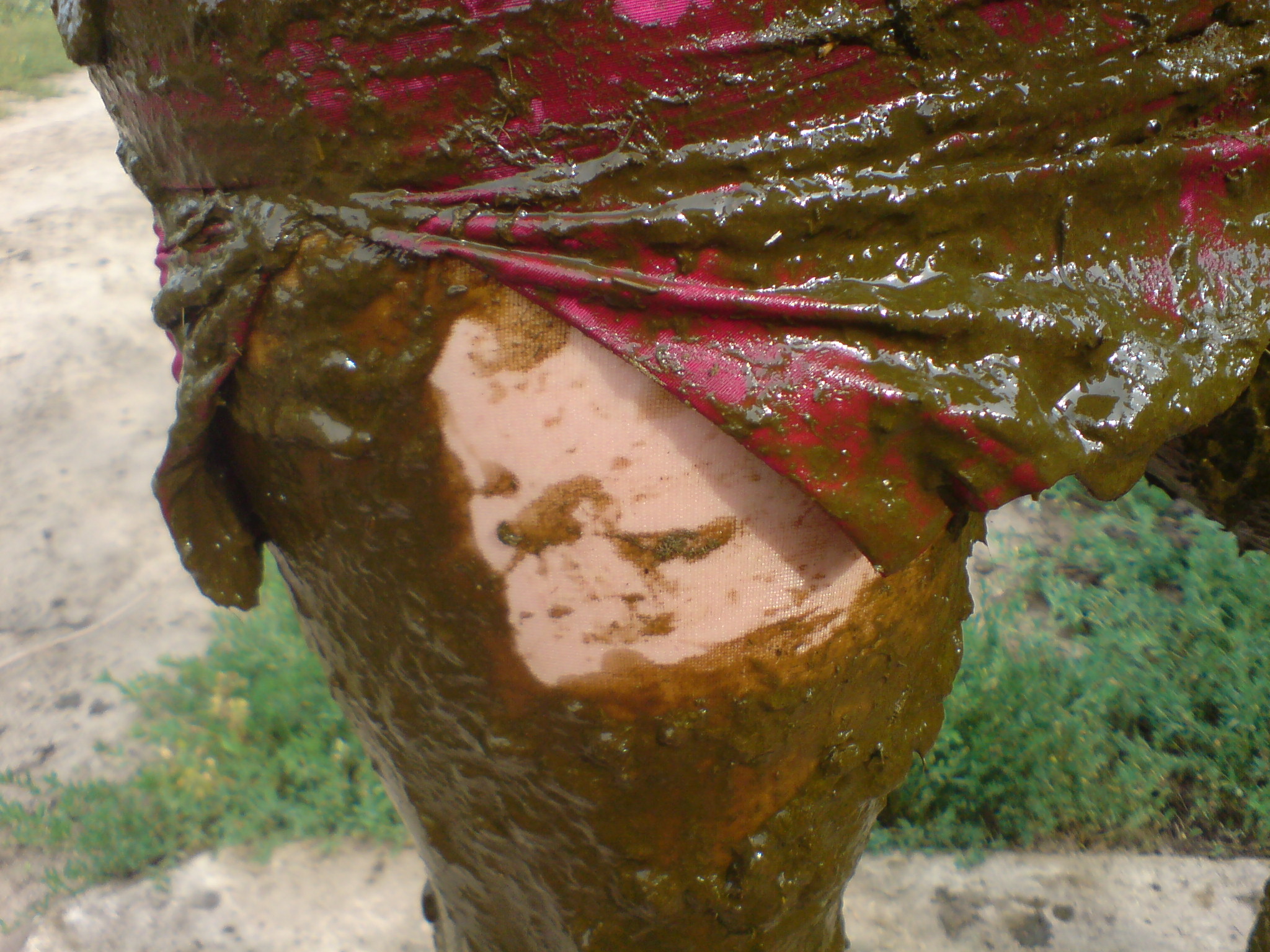 - a green woolly pullover (combined with a pair of white jeans) smeared with cow dung from cow patties on a meadow and later filled with a huge amount of semi fluid cow dung remained from the cleaning of the milking parlor in the cow shed,