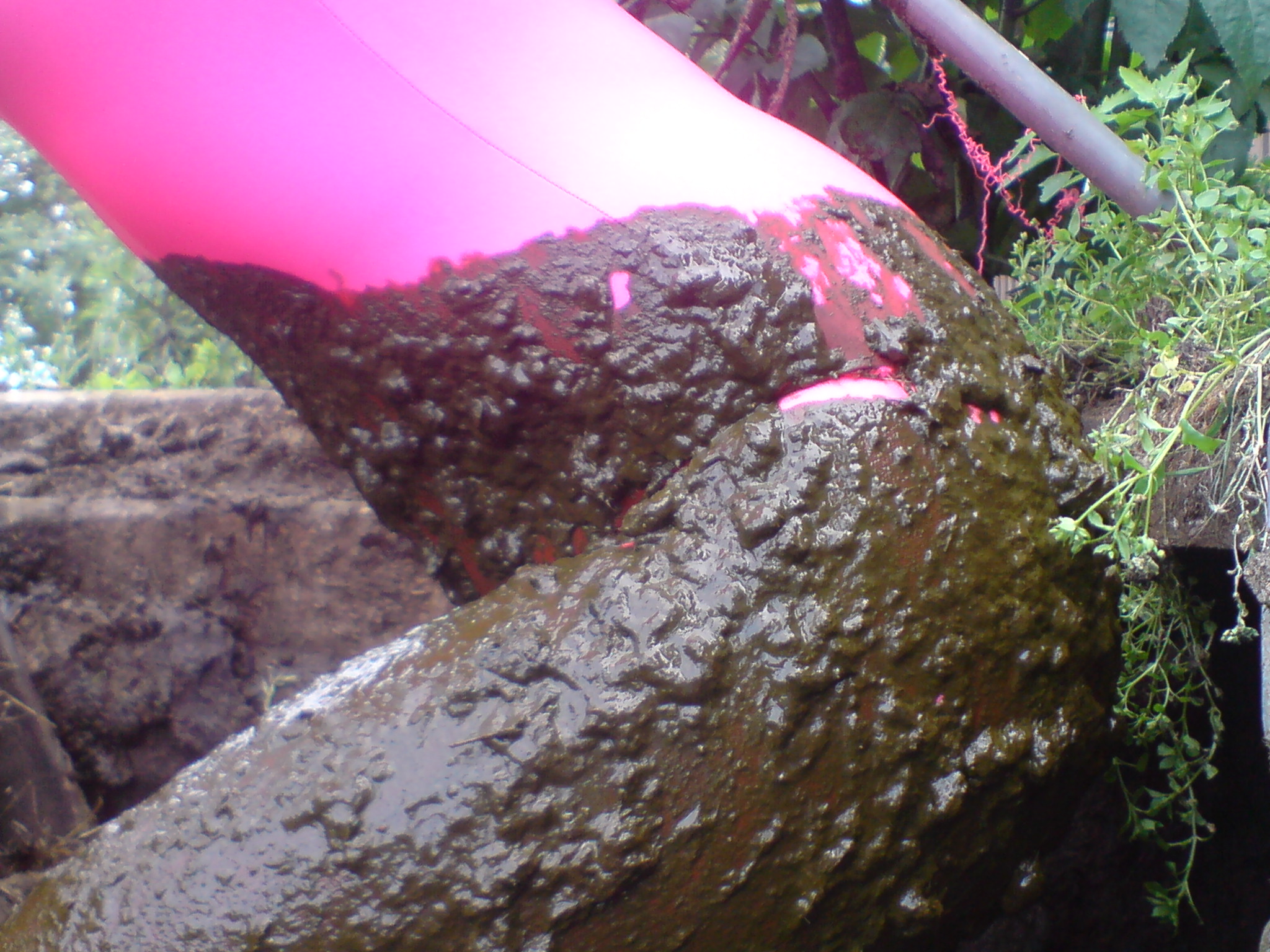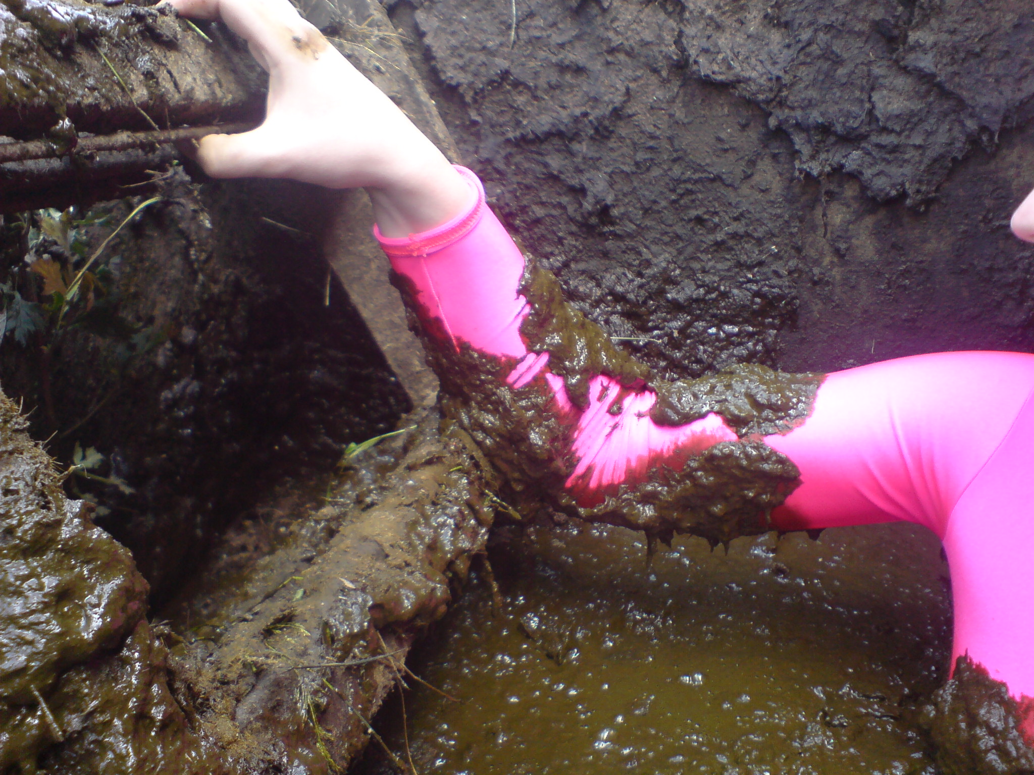 - a girl standing in manure up to her breasts wearing a pink catsuit submerged her right elbow into the green muck and now raises it again,