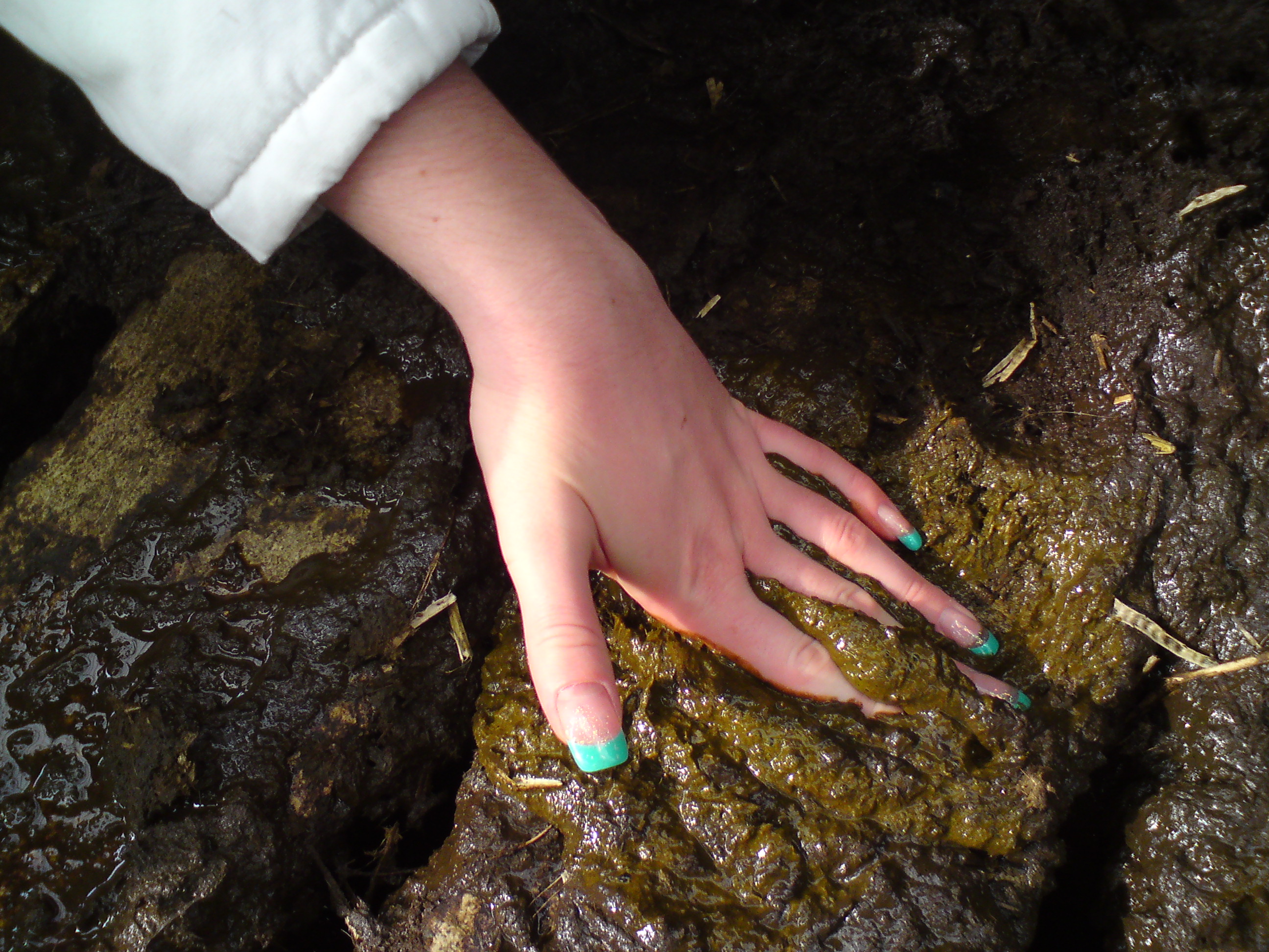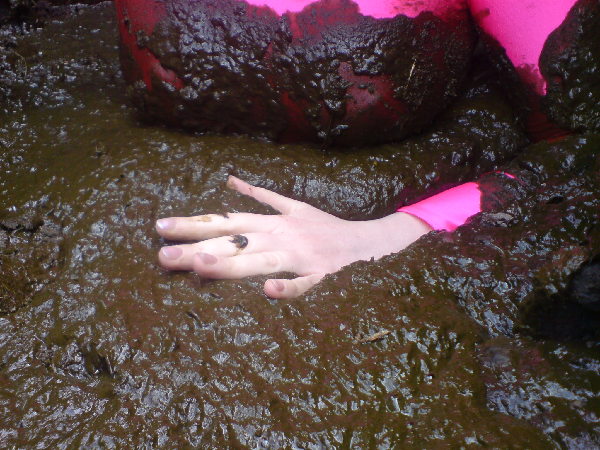 - a girl standing in manure up to her breasts submerging her clean left hand into the thick green muck, then even the right hand; in the background her boobs are visible (clothed in a very (!) thin catsuit),