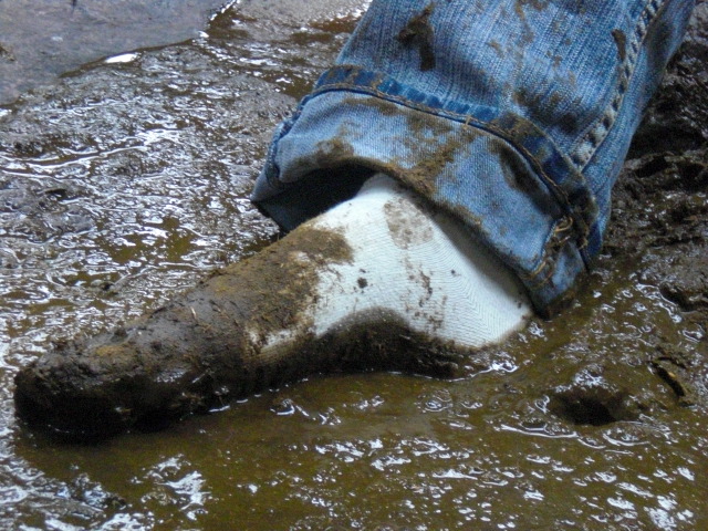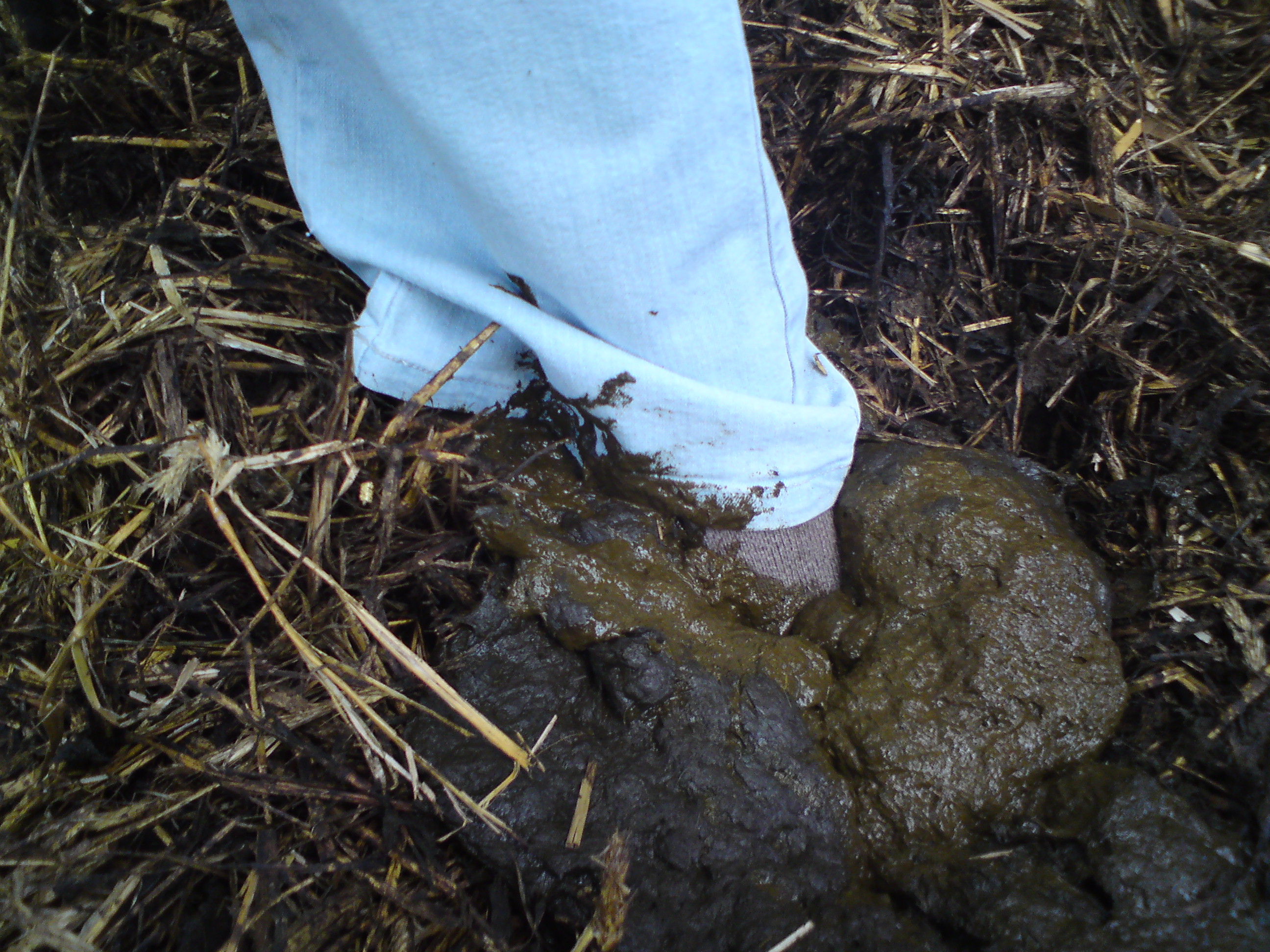 - a girl wearing grey winter socks while walking through a muck heap with very soft cow patties in it, which leads to her sinking into the dirt up to her ankles.