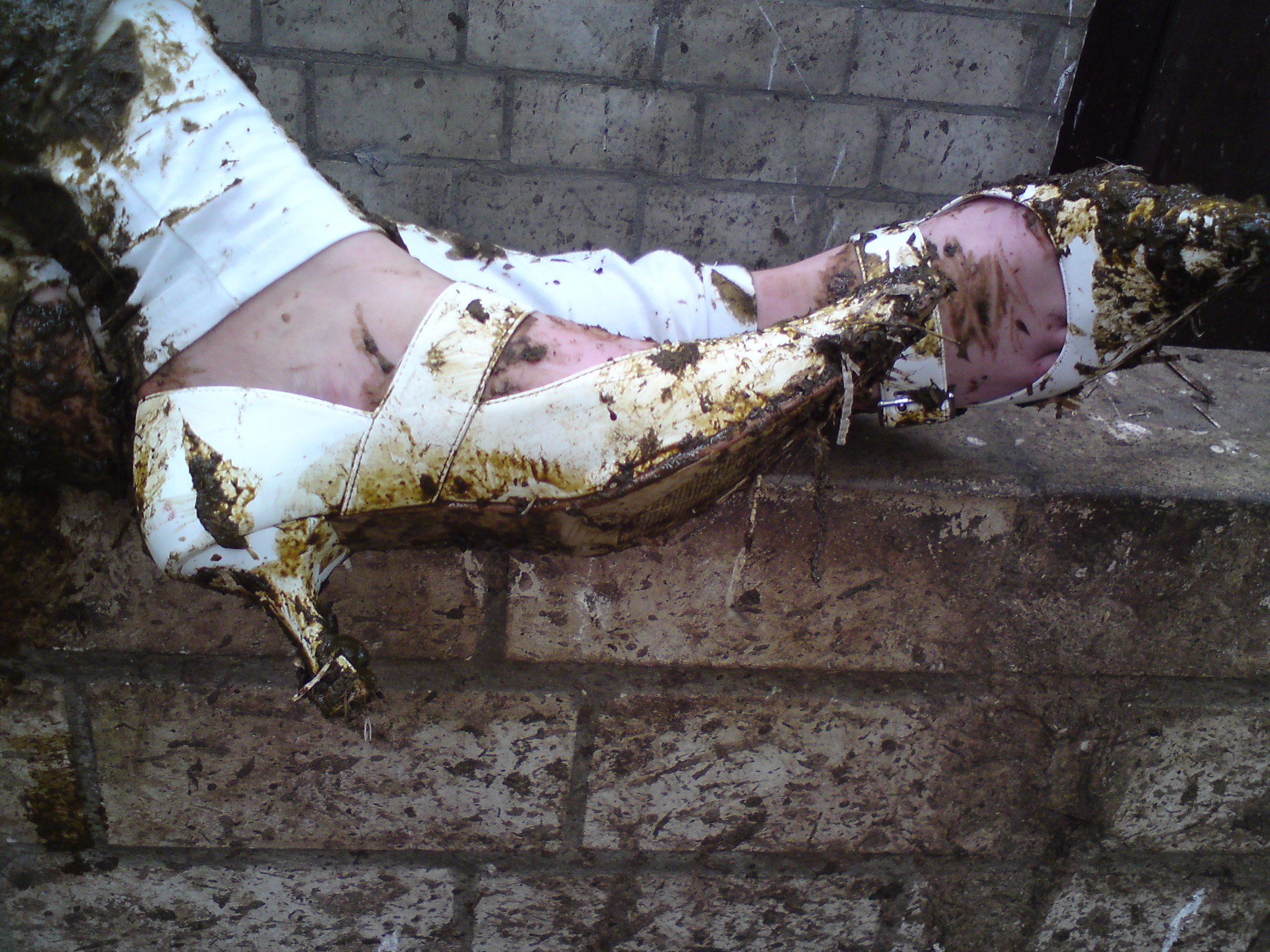 - a girl climbing down into a manure pit wearing an already stained 3000,--€-wedding dress, first spyed from the manure pit while she is standing on the ladder, then after she enjoyed a first dip in the manure thus the bottom part of the dress being soaked with manure,