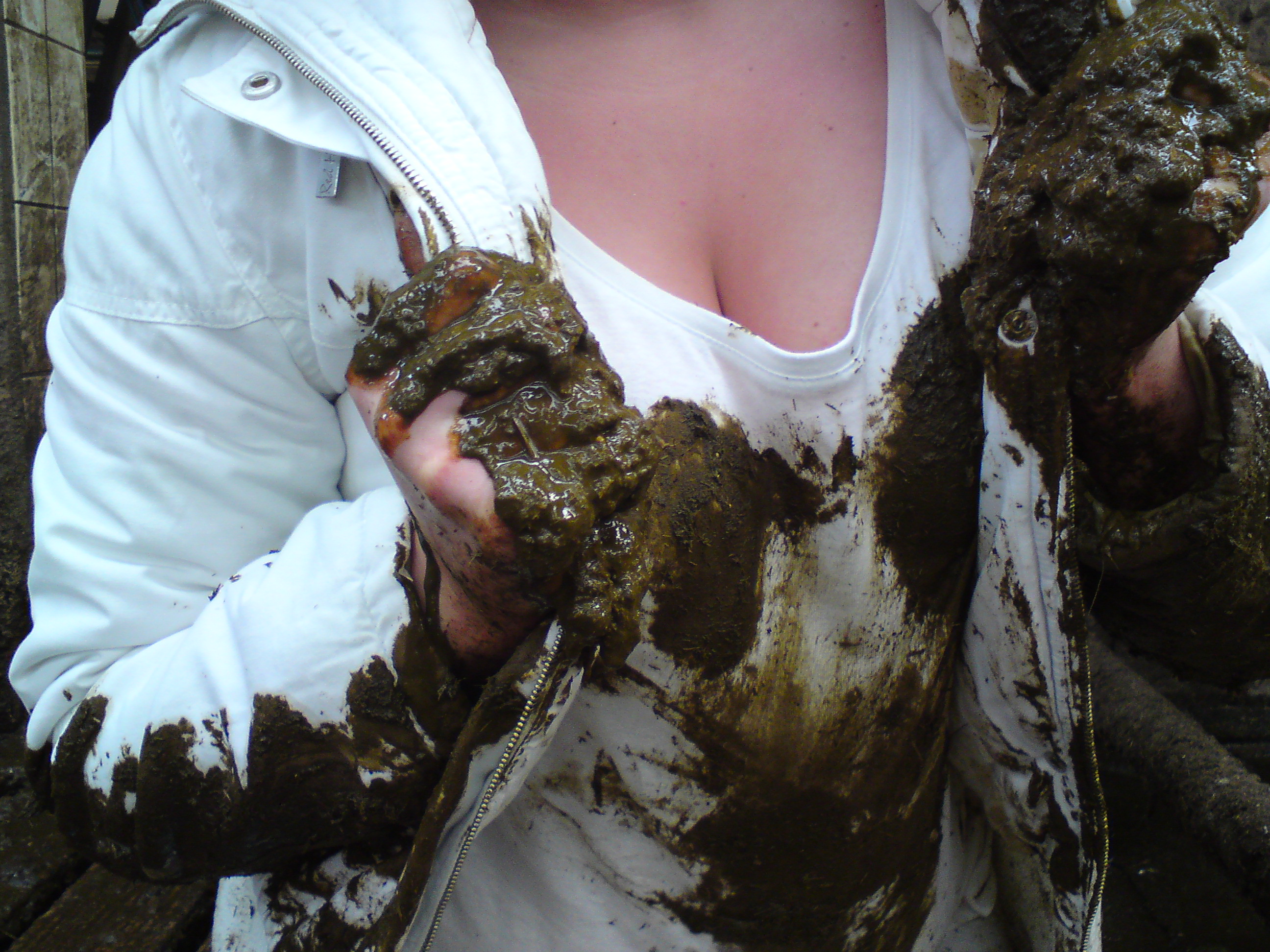 - a girl wearing a white sweatshirt having the breasts competely covered in thick cow dung,
